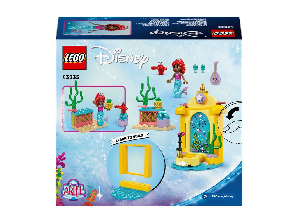 Součástí této stavebnice je minipanenka LEGO ǀ Disney Ariel a figurka zvířátka LEGO ǀ Disney Sebastiana. Nechybí pódium s otočnou podlahou, bufet s židlí a řada zábavných inspirativních prvků, včetně kytary, rumba koulí a ananasu. Začátečnická kostka dá dětem pevný základ, díky kterému se rychle pustí do hraní, a k dispozici je také intuitivní návod v podobě barevného obrázkového průvodce s příběhem pro děti, které se teprve učí číst.