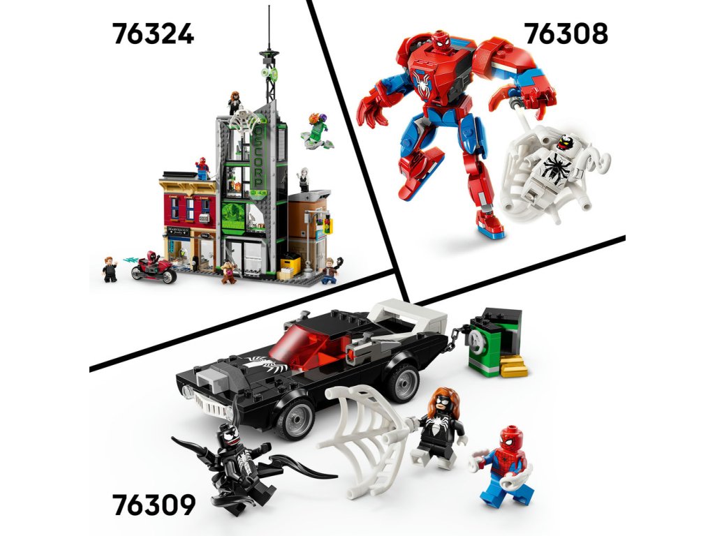Prémiová stavebnice LEGO® ǀ Marvel (76324) Spider-Man vs. Oscorp je plná superhrdinské akce, oblíbených postav a slavných míst. Tato městská scéna s řadou modelů představuje působivý dárek pro milovníky superhrdinů a sběratelských předmětů Marvel od 10 let. Pouliční scéna obsahuje 3 samostatné budovy: byt Milese Moralese s klenotnictvím v přízemí, kancelářskou budovu Oscorp a Venomův byt s večerkou v přízemí. Každá místnost obsahuje příslušné vybavení a doplňky. Osm minifigurek LEGO z filmů od studia Marvel se postará o nekonečné akční hraní s pavučinami: Spider-Man, Spider-Woman, Miles Morales s motorkou, Eddie Brock, Ghost-Spider, Norman Osborn, lovec Kraven a Zelený Goblin s kluzákem. Díky průhledným tyčím můžou děti umisťovat a polohovat postavy do realistických póz. Stavějte tuto zábavnou stavebnici společně s přáteli a rodinou pomocí aplikace LEGO® Builder. Stavebnice obsahuje 808 dílků.Dodatočné parametre