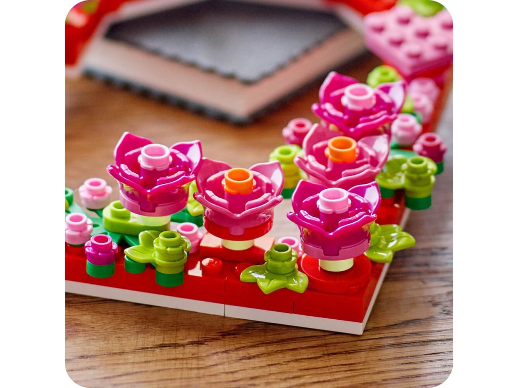 - Mezi dekorativními prvky najdete barevné květiny, listy a srdíčka z dílků LEGO®