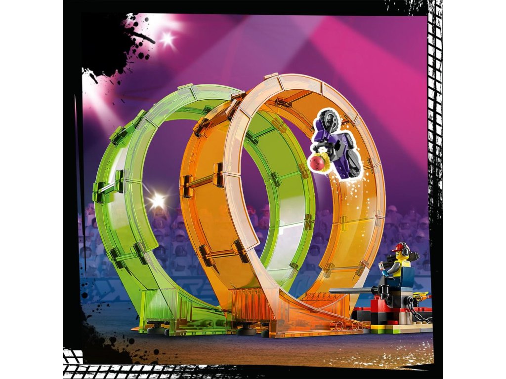 Stavebnice LEGO® City Kaskadérská dvojitá smyčka (60339) nabízí řadu zábavných prvků – obsahuje 2 kaskadérské motorky se setrvačníkem a monster truck s rampou pro předvádění skutečných triků. V aréně dále najdete ohnivou stěnu, smyčku s hadí tlamou, ohnivou smyčku a řadu doplňků. O úžasnou závodní atmosféru se pak postará 7 minifigurek, mezi kterými nechybí 2 kaskadérští jezdci.