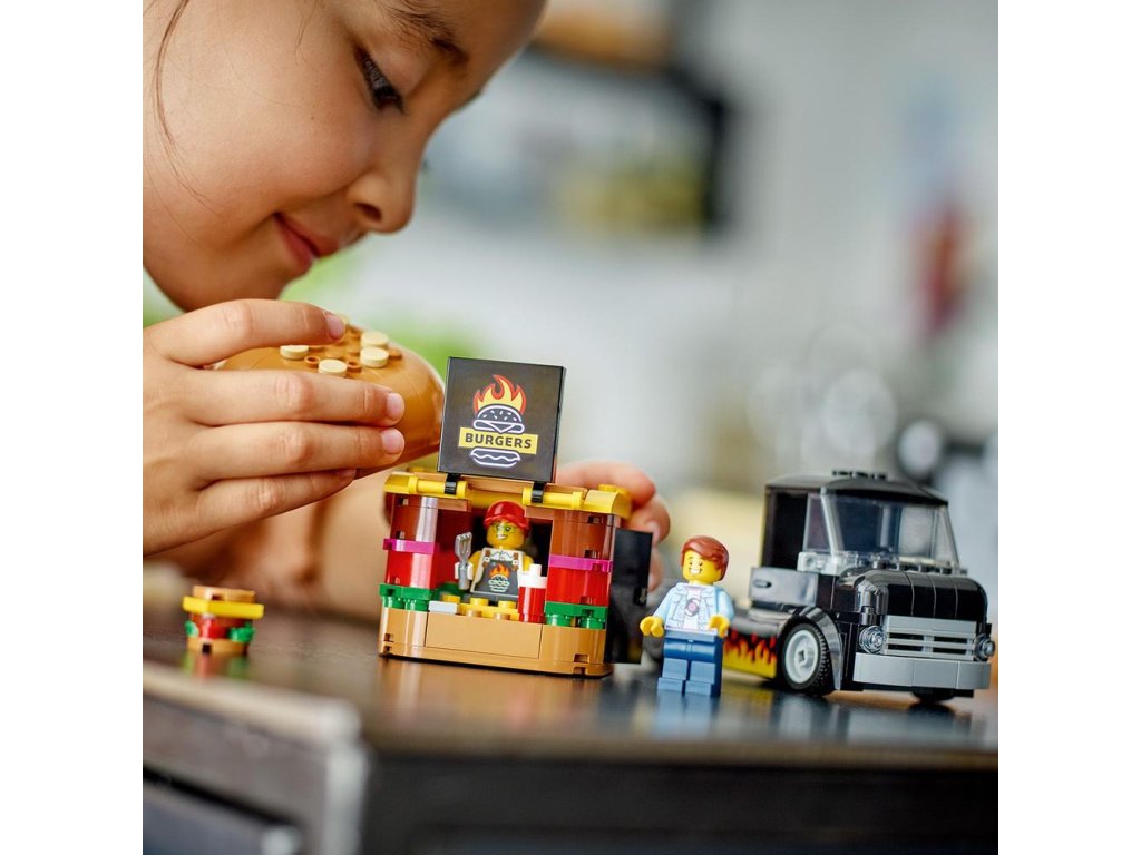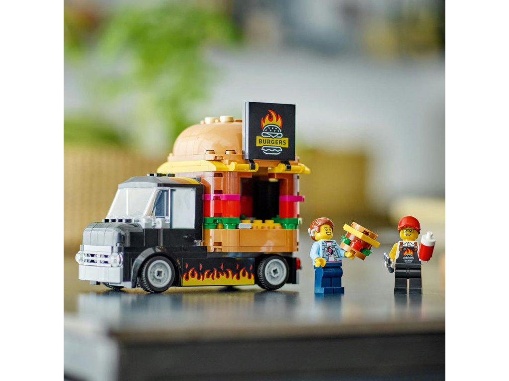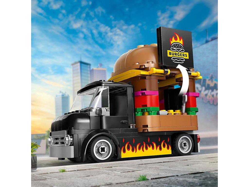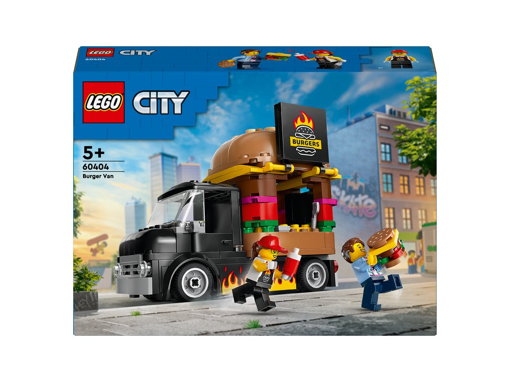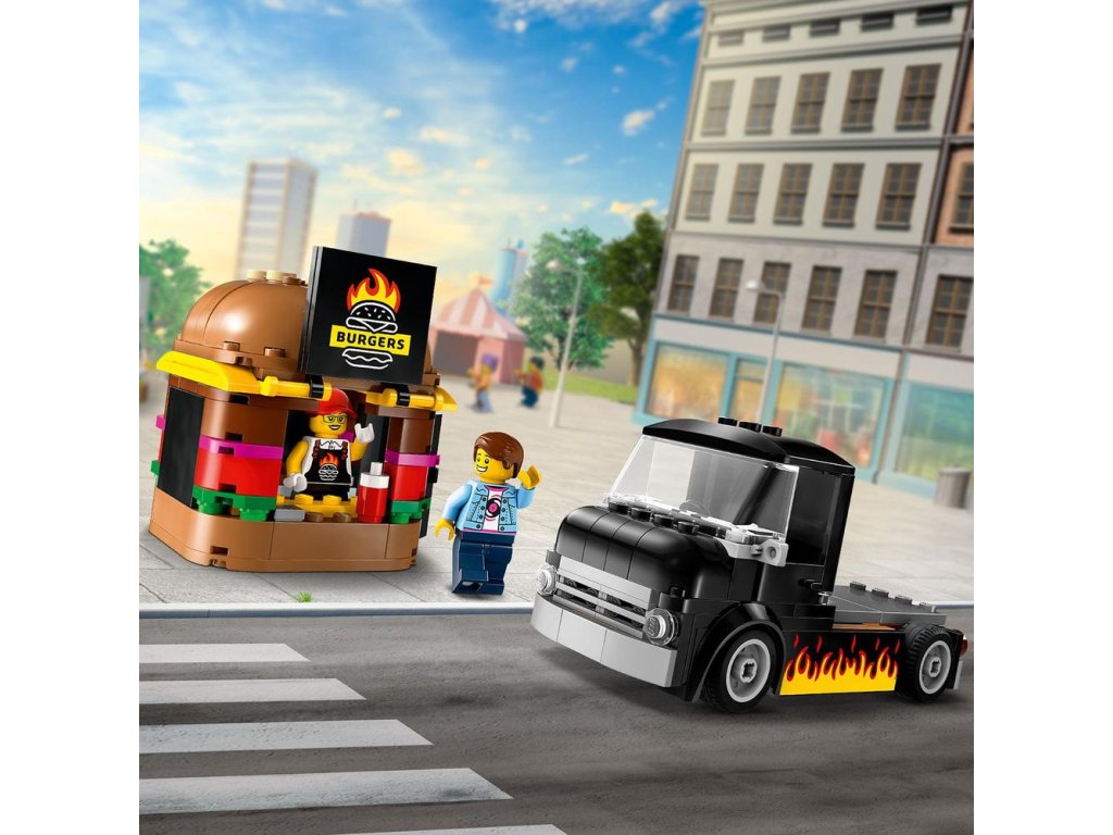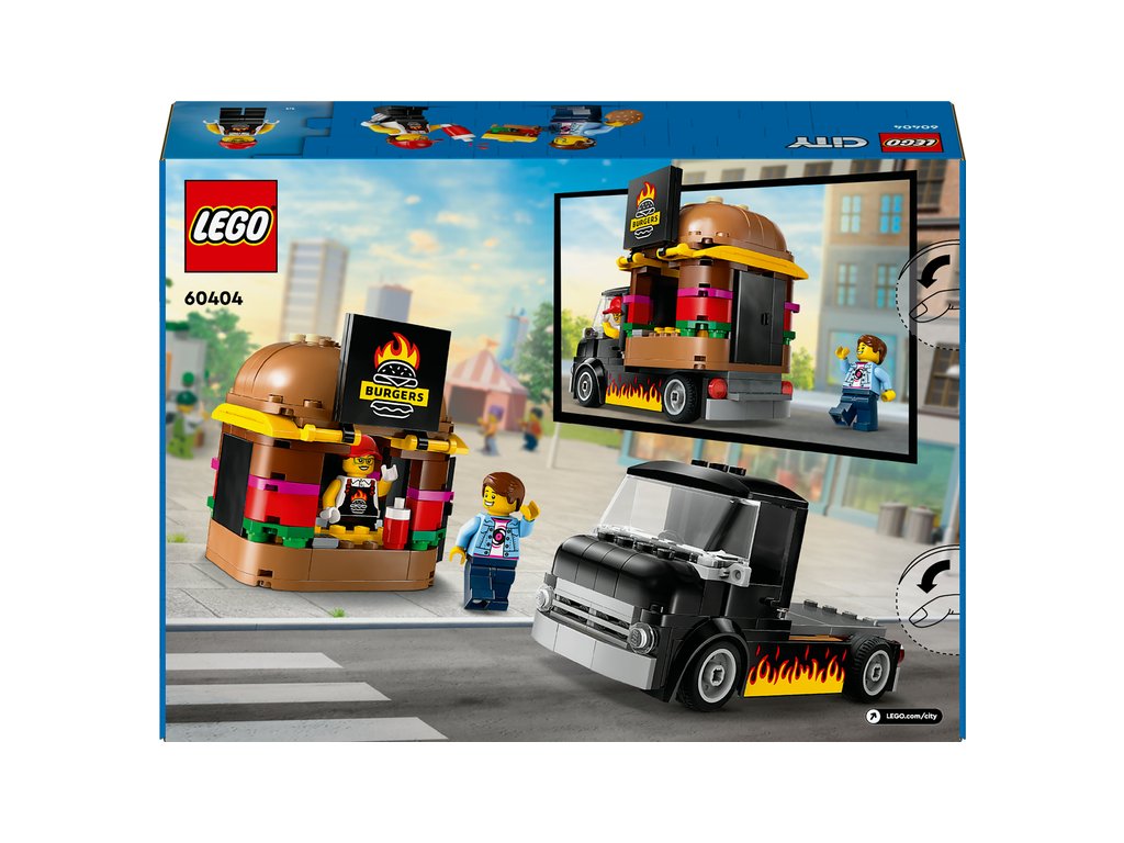 Stavebnice LEGO® City (60404) Hamburgerový truck rozproudí fantazii malých stavitelů od 5 let. Střechu pojízdné prodejny hamburgerů zdobí obří burger a propracovaný prostor na přípravu jídla s řadou omáček a dochucovadel lze vyjmout. Zvedněte dvířka a odhalte ceduli s burgerem grilovaným na ohni. Součástí stavebnice je také minifigurka prodejce a zákazníka s naslouchátkem.