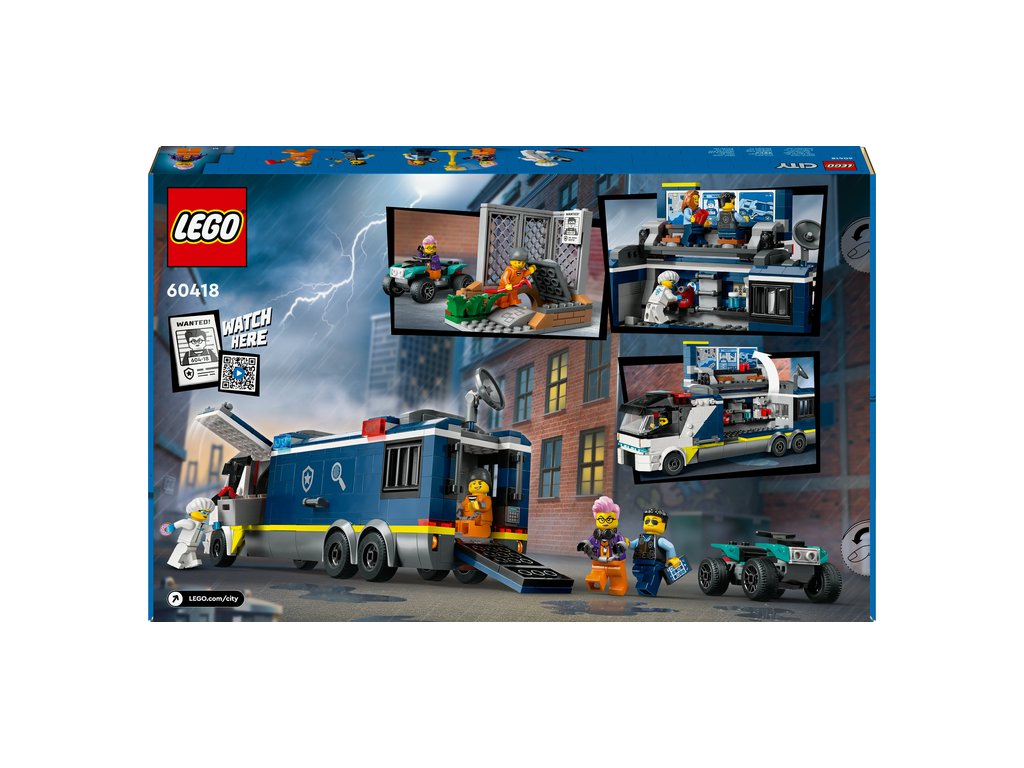 Vyšetřování stop, které za sebou zanechali zločinci na útěku, to je úkol pro policisty ve stavebnici 60418 LEGO® City Mobilní kriminalistická laboratoř policistů. Tato skvělá herní sada pro děti od 7 let obsahuje nákladní auto, které se otevře a odhalí dvouúrovňovou laboratoř pro zkoumání místa činu s pracovišti, mapou, monitory, mikroskopem, kávovarem a vězením. Součástí sady je také forenzní scéna a čtyřkolka zločinců. Pro vskutku epická dobrodružství stačí přidat minifigurky 2 policistů, 1 vědce a 2 zločinců.