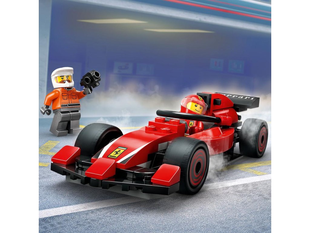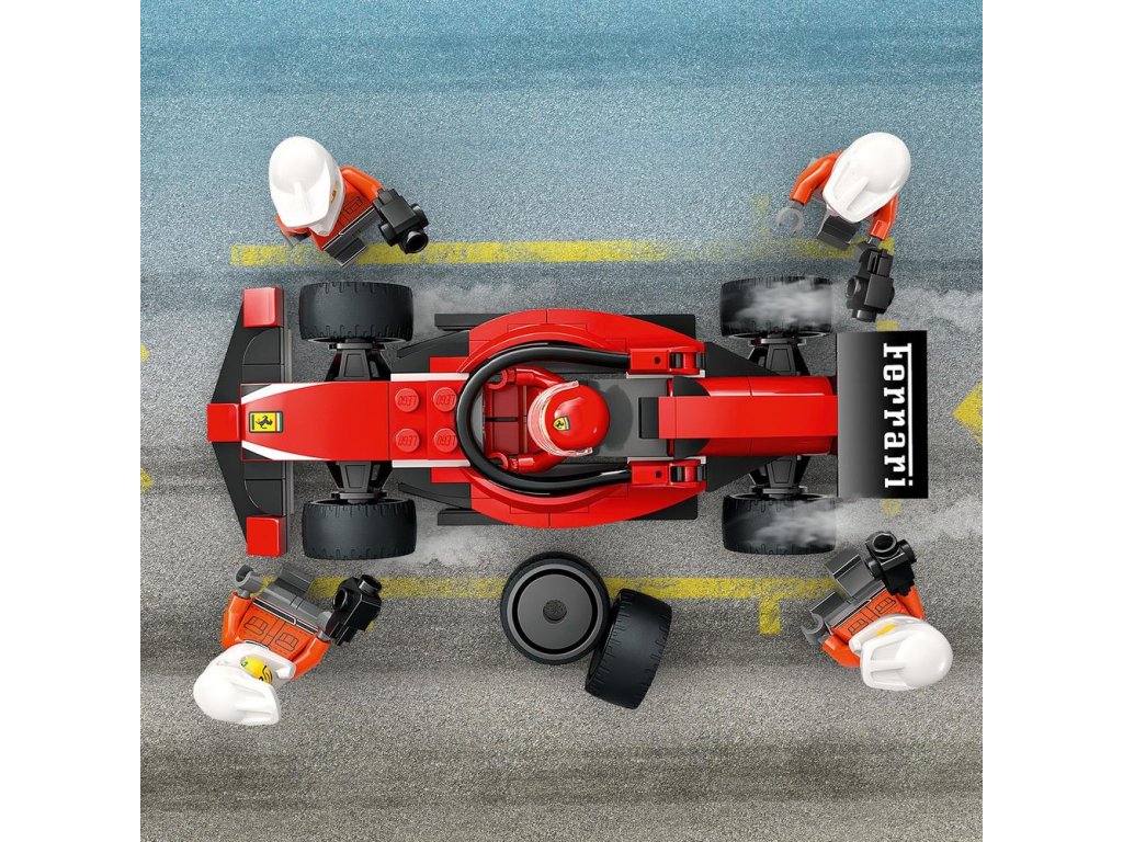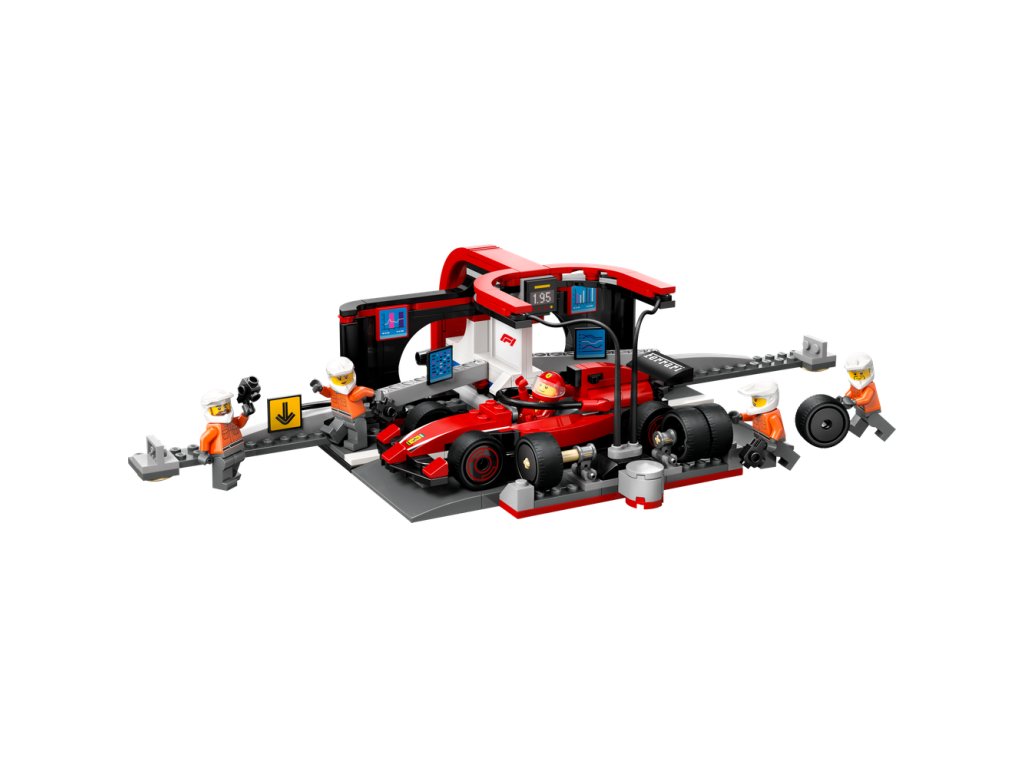 • Zastávka v boxech F1® s vozem Ferrari a minifigurka řidiče a 4 členů personálu