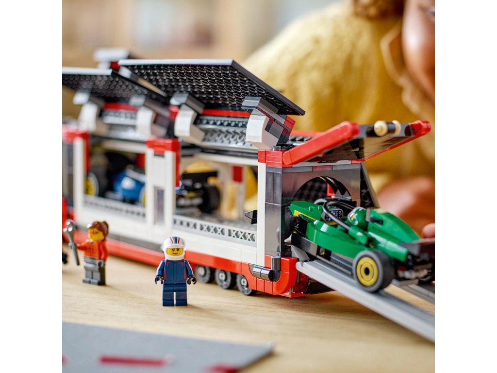 • Model kamionu se 2 závodními vozy Formule 1 a 5 minifigurkami