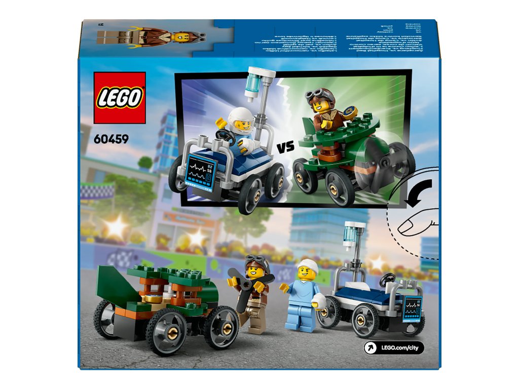Potěšte malé milovníky závodů od 5 let stavebnicí LEGO® City (60459) Závodní balíček: Letadlo vs. nemocniční lůžko. Tato zábavná závodní stavebnice obsahuje 2 závodní minikáry a 2 minifigurky. Děti postaví pilota v letadle proti pacientovi na překvapivě rychlém nemocničním lůžku. Kdo vyhraje? Sedněte za volant a pusťte se do napínavých městských závodů!