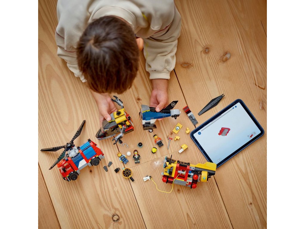 Součástí této herní stavebnice LEGO s helikoptérou, hasičským vozem a ponorkou je tištěný návod na stavění a 3D pokyny v aplikaci LEGO Builder, což je digitální průvodce stavěním s intuitivními nástroji přibližování a otáčení. Umožní dětem prohlížet si modely ze všech úhlů, zatímco na nich pracují.