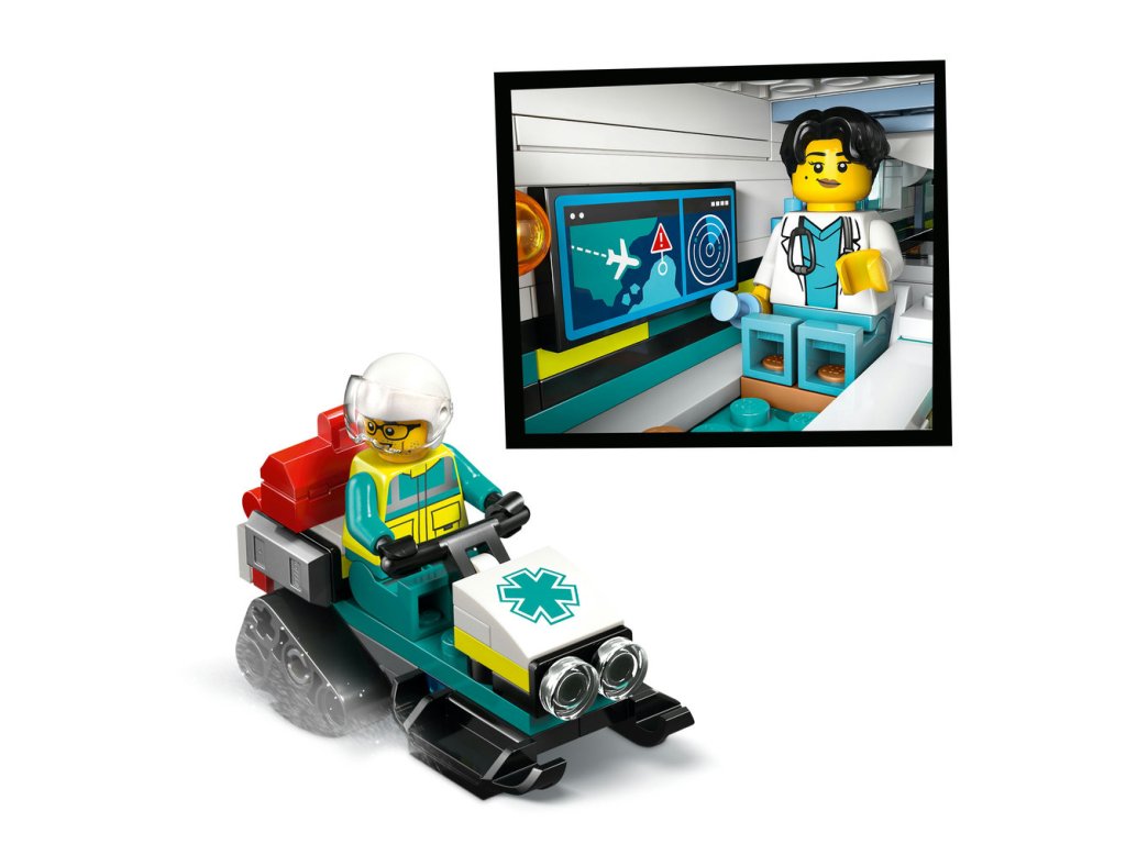 • Obsahuje model letadla, sněžný skútr, scénu s malým letištěm a 4 minifigurky