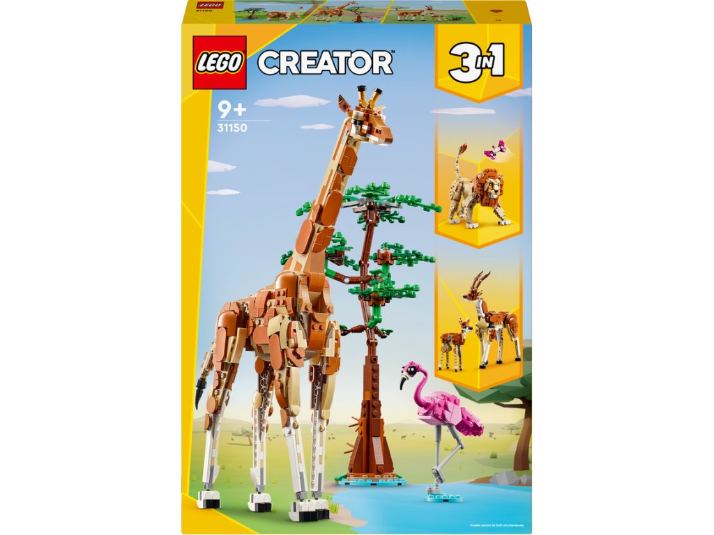 Děti od 9 let se se stavebnicí LEGO® Creator 3 v 1 (31150) Divoká zvířata ze safari budou cítit jako mezi skutečnými zvířaty. Užijí si nápadité hraní s modely zvířat, včetně žirafy s pohyblivýma nohama, dlouhým krkem, ocasem a ušima, která se tyčí vedle modelu stromu a plameňáka. Jakmile herní dobrodružství skončí, děti si mohou všechny 3 modely vystavit.