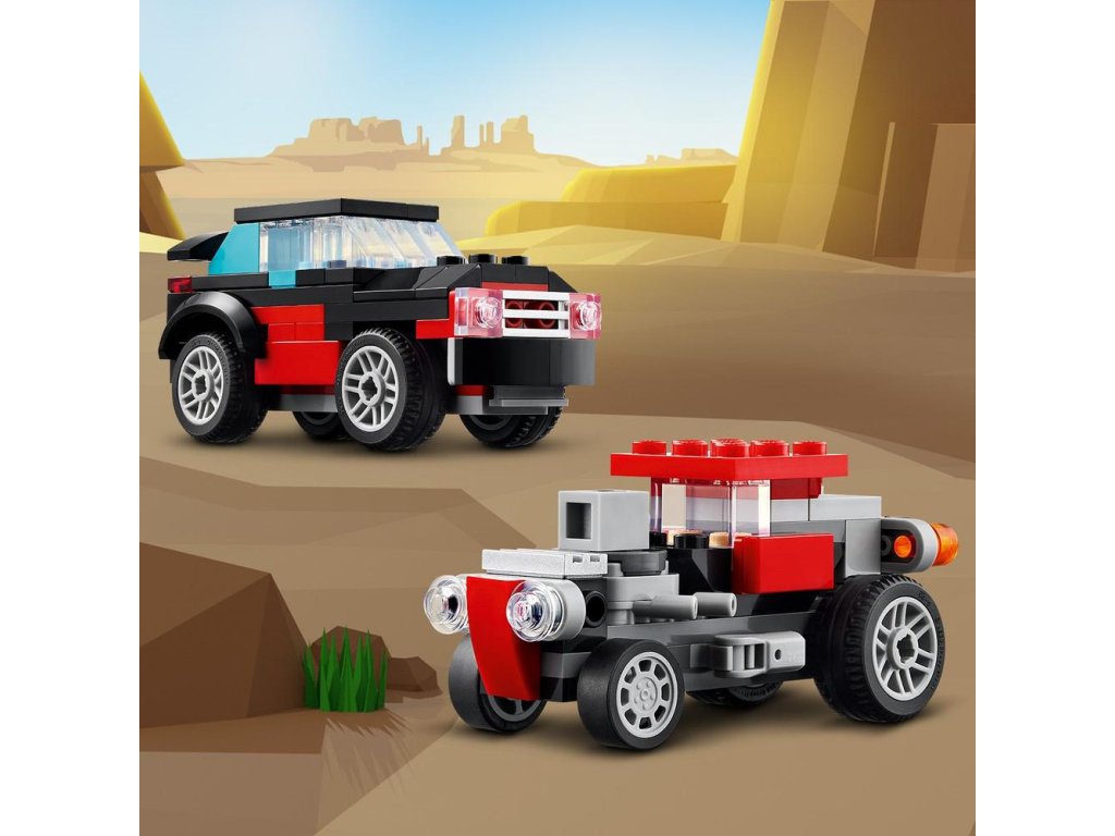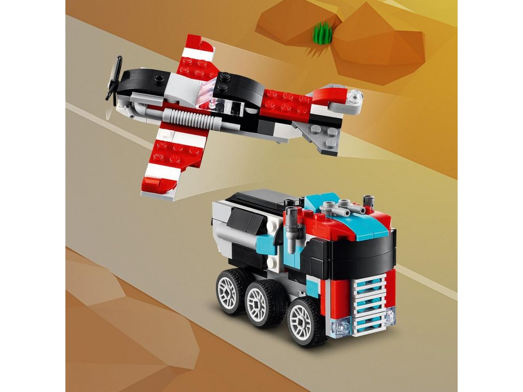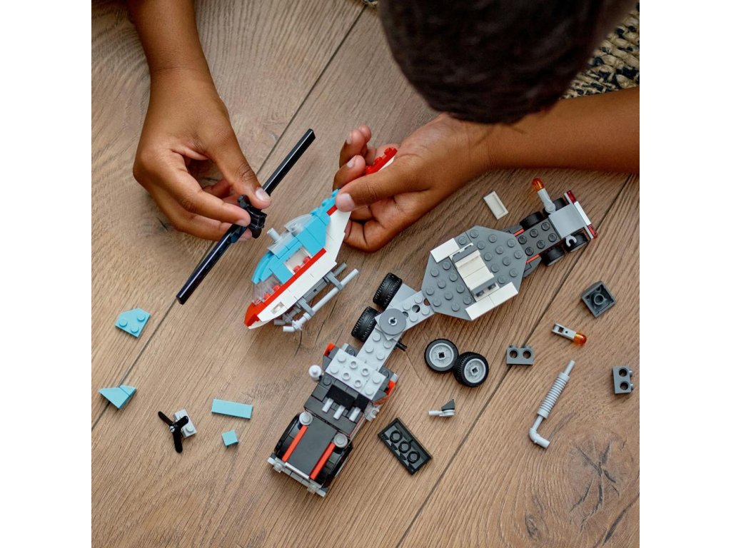 Malí stavitelé si s touto stavebnicí z řady LEGO® Creator 3 v 1 poskládají hned 3 různé dvojice modelů. Nejprve si postaví třeba náklaďák s plochou korbou a helikoptéru, pak modely přestaví na vrtulové letadlo a náklaďák s palivem s otáčecími koly a pak se vydají na závody s modely hot rodu a SUV – nebo si postaví vlastní originální vozidla.