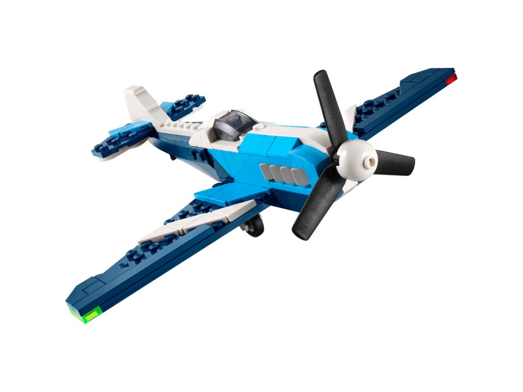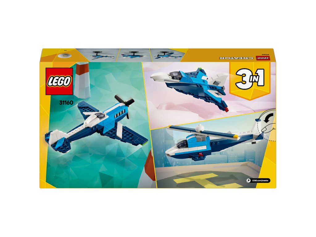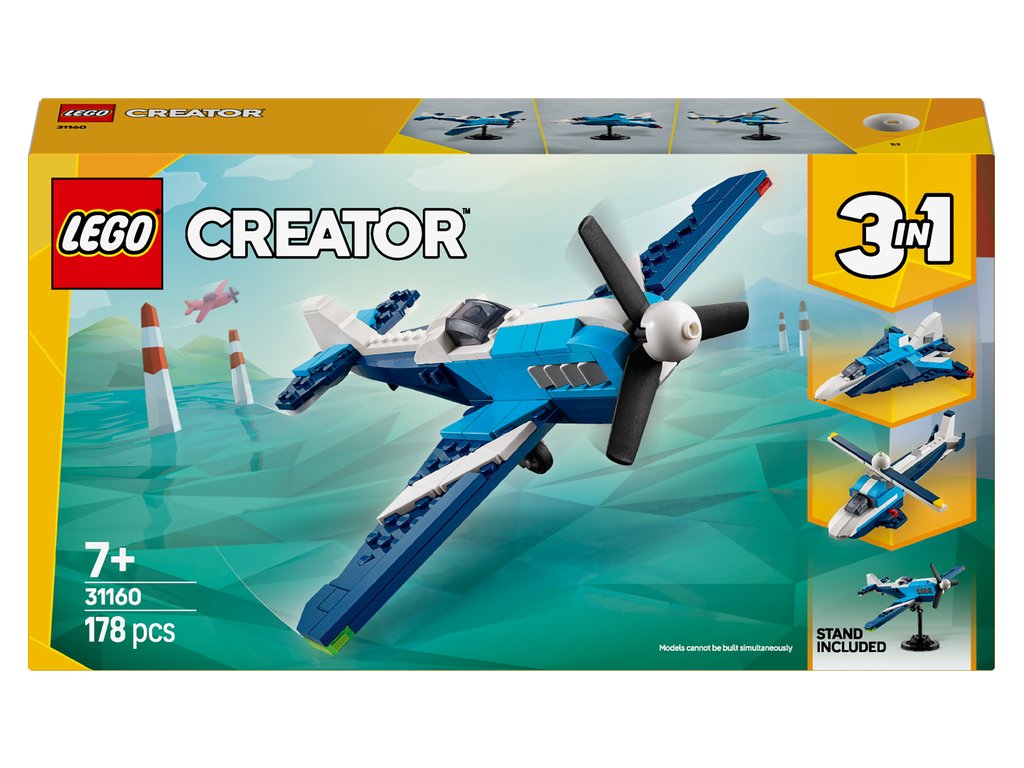Na kluky a holky od 7 let se stavebnicí LEGO® Creator 3 v 1 (31160) Závodní letadlo čekají superrychlá dobrodružství. Model letadla má vpředu otočnou vrtuli, pohyblivá kola, aby se mohlo pohybovat po zemi, a podstavec z kostek na vystavení.