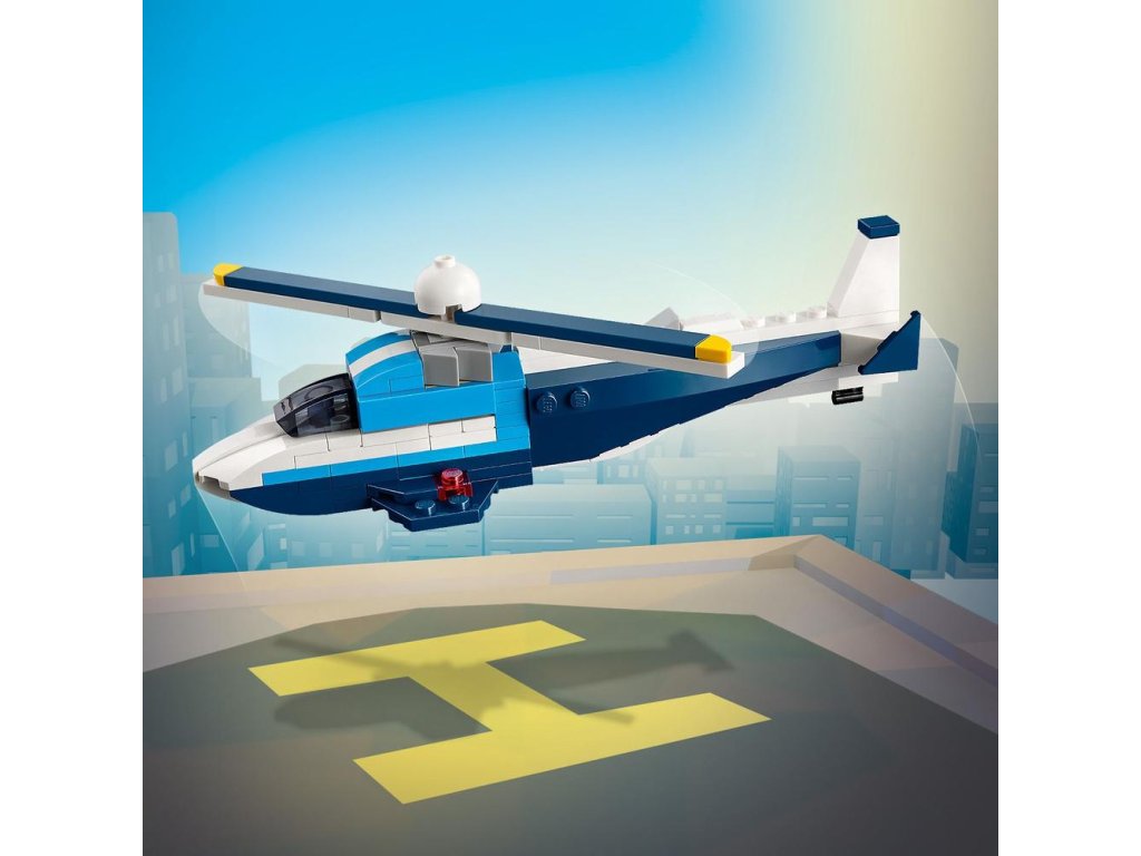 Děti si postaví 3 úžasná vozidla: model letadla s otáčející se vrtulí a pohyblivými koly, tryskáč s pohyblivými koly a helikoptéru s listovým rotorem. Každý model lze vystavit na stojanu z kostek. Stavebnice představuje působivý dárek pro děti, které mají rády nápadité akční příběhy.