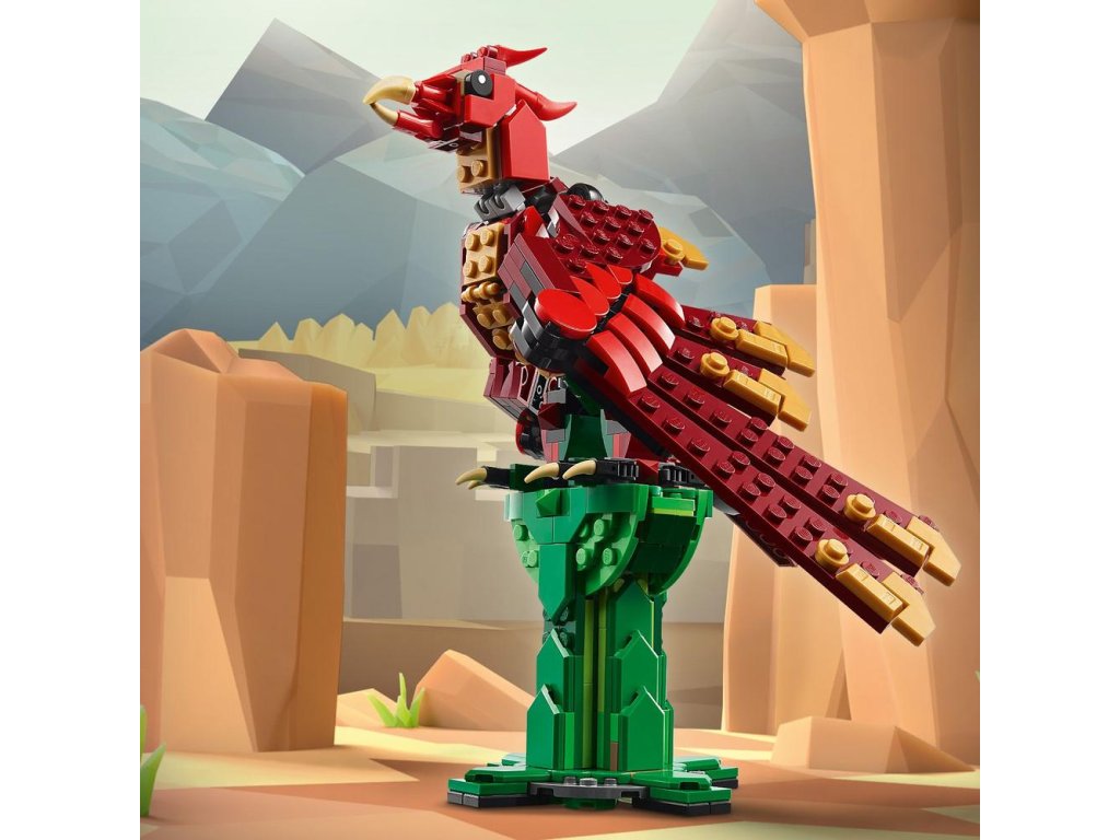 Fanoušci bájných zvířat si postaví 3 různé stavebnice ze stejné sady kostek: pohyblivou figurku draka, pohyblivého mořského hada nebo pohyblivého fénixe. Všechny 3 modely mytických stvoření v této přestavitelné sadě představují skvělé narozeninové hračky pro děti.