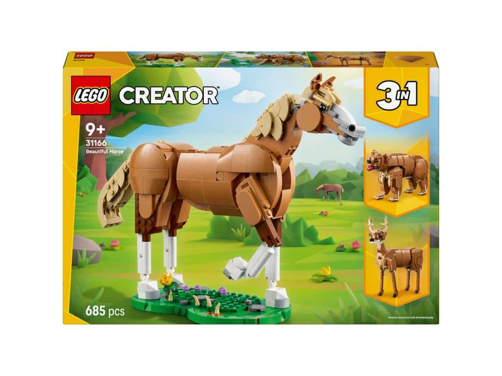 Holky a kluci od 9 let, kteří milují zvířata, čekají hodiny zábavných příběhů se stavebnicí Krásný kůň (31166). Tento pohyblivý kůň dokáže pohybovat hlavou, krkem, boky, kopyty, ocasem a jedním kolenem a je umístěný na podložce s efektem trávy, na které si ho děti můžou vystavit ve 3 různých polohách: vestoje na 3 nebo 4 nohách, nebo na 2 zadních nohách. Děti čekají hned 3 různé možnosti stavění ze stejného balení kostek: Pohyblivý kůň LEGO®, pohyblivý medvěd s malým modelem vodopádu a pohyblivý elegantní srnec. Všechny 3 figurky zvířátek v této stavebnici na přestavování představují kreativní a zábavné dárky pro děti. Stavebnice LEGO Creator 3 v 1 inspirují děti ke kreativnímu stavění – v každé krabici najdou dílky k sestavení a přestavování 3 různých modelů. Se stavebnicemi 3 v 1 si postaví modely inspirované jejich zájmy, včetně superrychlých vozidel, úžasných zvířat a propracovaných domů. Modely nelze sestavit současně. Stavebnice obsahuje 685 dílků.Dodatočné parametre