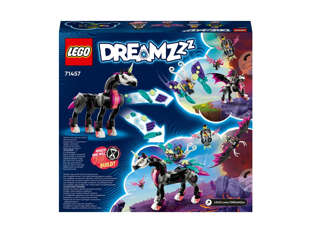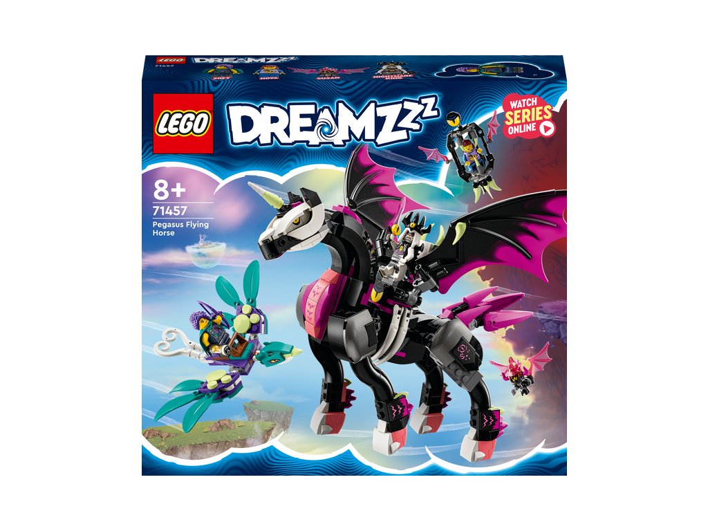 Tato stavebnice LEGO® DREAMZzz™ (71457) Létající kůň pegas vtáhne děti od 8 let přímo do akce ve Světě snů. Podobně jako v televizním seriálu se tu odehrává příběh Zoey a její záchranné mise za kamarádkou Novou, kterou unesla noční můra Susan na létajícím koni pegasovi. Návod na stavění vedený příběhem vtáhne děti do akce a podnítí jejich představivost při rozhodování o tom, co Zoey podnikne.