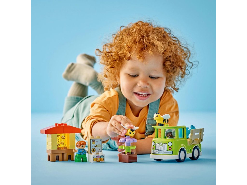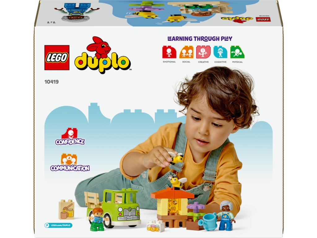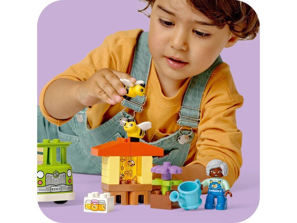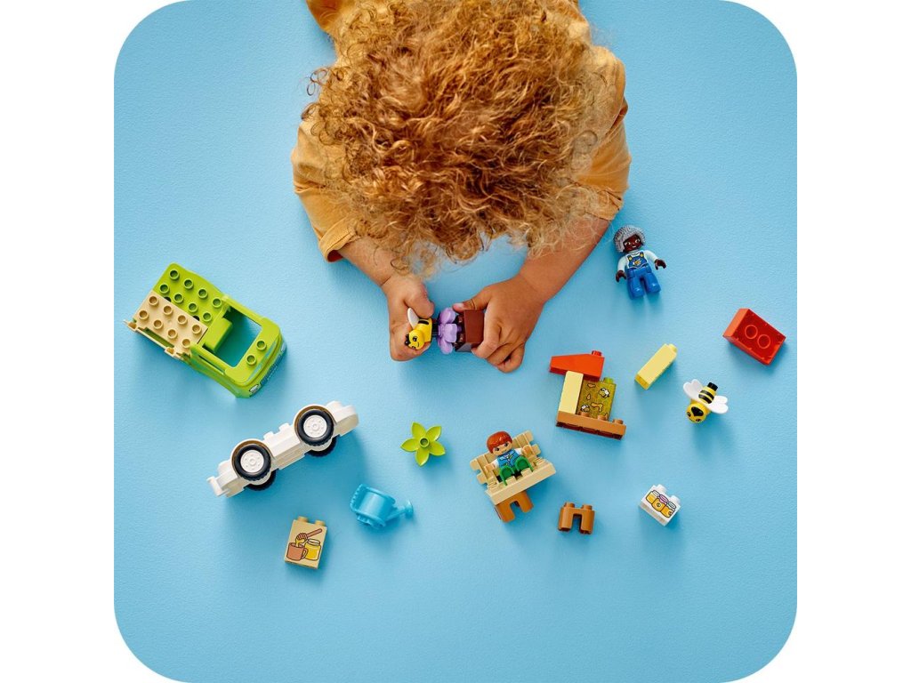 Děti poskládají stonky květin, které „rostou“, a procvičí své jemné motorické schopnosti. Užijí si hodiny zábavy při hře s včelkami, které sbírají nektar a v úlu z něj tvoří med. Nechybí ani 2 figurky LEGO DUPLO, kterým malí stavitelé pomohou sbírat med, naložit jej na model náklaďáku a odvézt ho na tržiště.