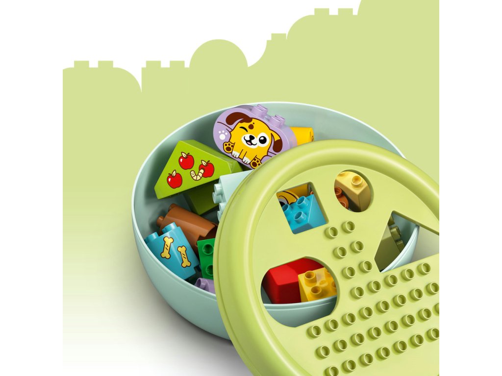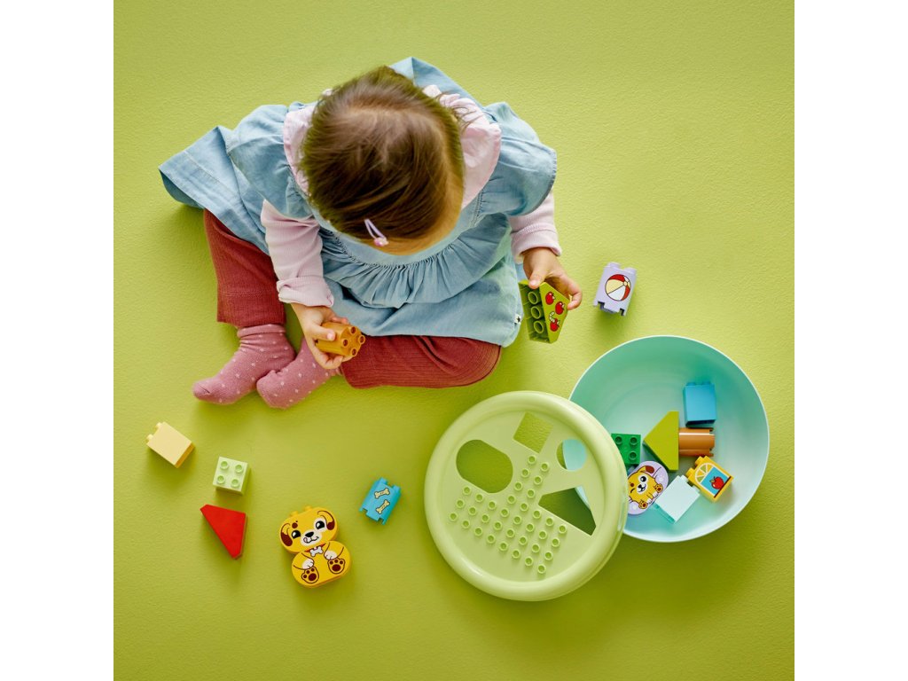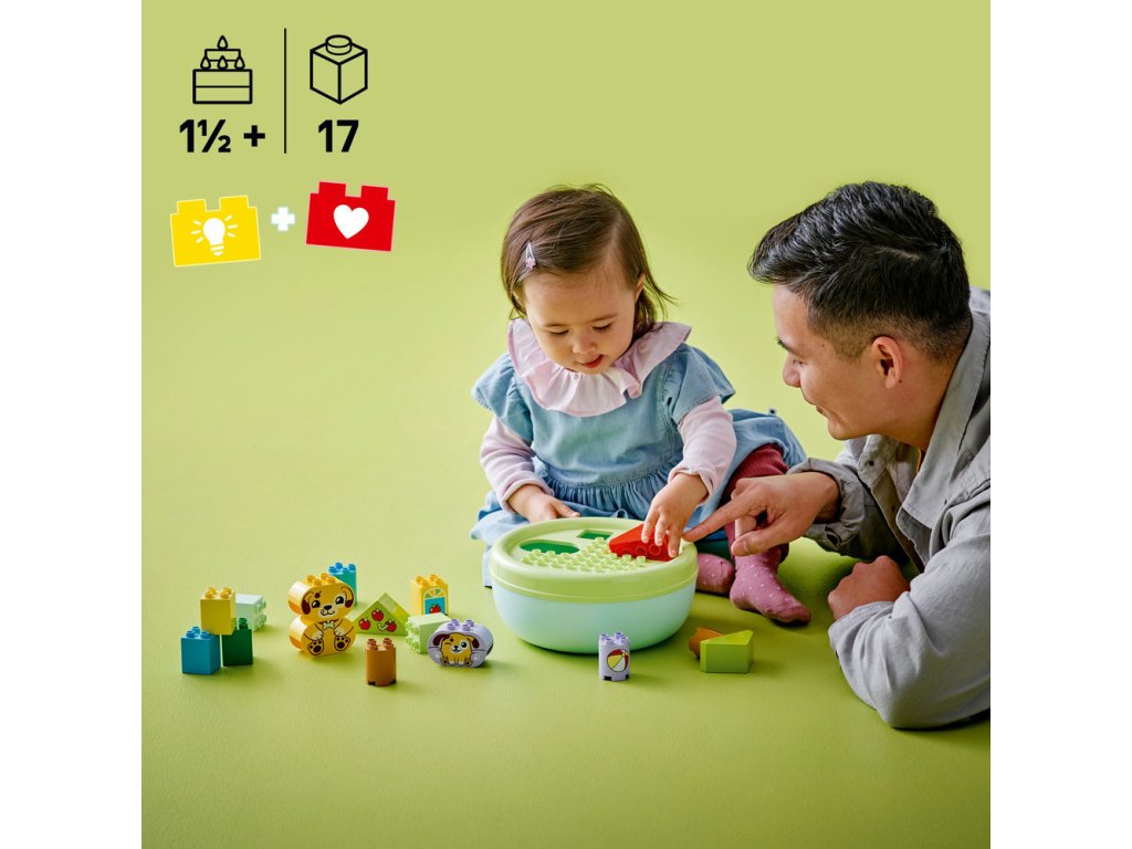 Darujte malým milovníkům pejsků kouzelnou stavebnici Třídění tvarů: Domeček pro štěňátka (10441), která přináší hned dvě možnosti hraní. Tato hračka pro děti od 18 měsíců pomáhá rozvíjet jemnou motoriku a děti s ní objeví nové tvary. Stavebnice navíc rozvíjí dovednost řešení problémů, když děti z kostek postaví místo na hraní pro štěňátka a pak si vyzkouší vhazování kostek různých tvarů do víka misky. Tento dárek pro batolata pomáhá rozvíjet prostorovou orientaci a je nabitý zábavnými vzdělávacími aktivitami pro celou rodinu. Rodiče můžou dětem ukázat všechny tvary v balení, které pak malí stavitelé použijí ke stavění stromů, figurek psů a dokonce i domu. Pak si užijí kreativní hraní s roztomilými pejsky LEGO® DUPLO®, hodí jim míč a nakrmí je kostí. Až nápadité stavitelské dobrodružství skončí, děti si užijí spoustu zábavy při třídění tvarů. Procvičí svou schopnost soustředění při hledání děr, do kterých se vejdou jednotlivé kostky. A pokud se jim to napoprvé nepovede, procvičí trpělivost a koordinaci očí a rukou při snaze najít ten správný otvor. Obsahuje 17 dílků.