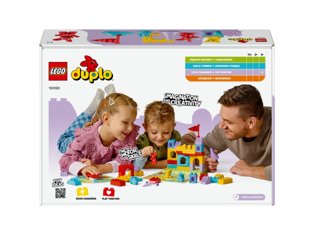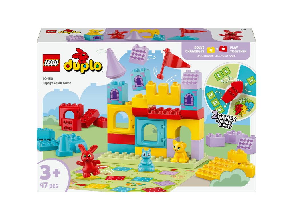 Užijte si se svou ratolestí hodiny rodinné zábavy a pomozte jí učit se hrou se stavebnicí 2 v 1 LEGO® DUPLO® (10450) Hopsy a hra s hradem. Děti se vydají na vzdělávací dobrodružství LEGO DUPLO a procvičí si počítání a třídění barev během hraní jedné ze dvou zábavných her. Děti se naučí poznávat barvy a čísla během kreativního stavění modelu hradu. Tato zábavná rodinná aktivita začíná tím, že si každý hráč vybere zvířátko a poté roztočí šipku, aby zjistil, o kolik míst na hrací ploše se může posunout. Do modelu pak přidá jednu kostku v té barvě, na které přistál. Hra končí, když všechny postavy dorazí na hrad. Ve druhé hře děti třídí barvy, aby zjistily, kdo dokáže postavit nejvyšší věž. Každý hráč roztočí šipku a zjistí, jakou barvu kostky může přidat do svého modelu. S touto vzdělávací stavebnicí si děti procvičí řadu dovedností, jako je střídání během hry, představivost a používání jemných motorických schopností během kreativního stavění nebo spolupráce s týmem během stavění hradu. Obsahuje 47 dílků.
