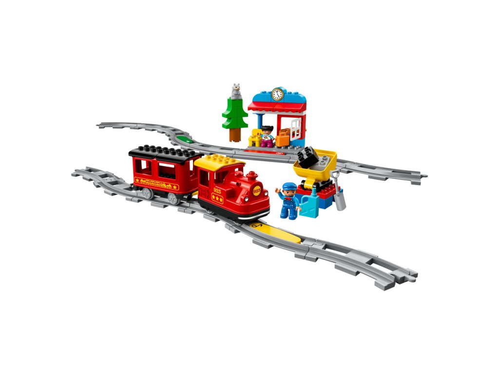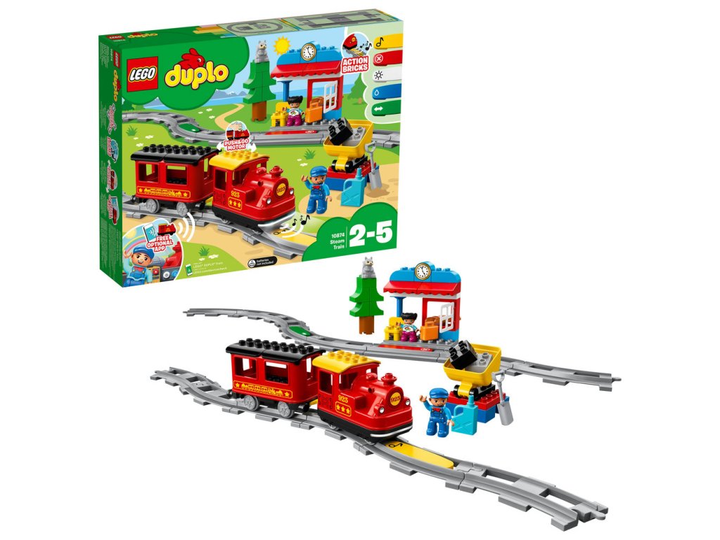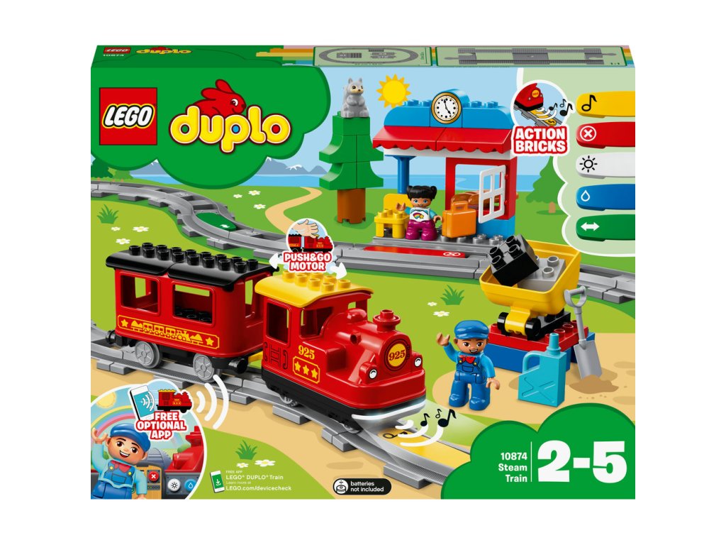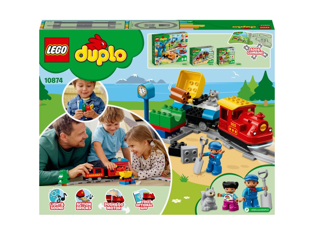 LEGO® DUPLO® 10874 Parní vláček je díky snadnému ovládání a spoustě interaktivních prvků vhodný i pro ty nejmenší. Děti se mohou stát strojvedoucím vláčku s motorem s technologií Push & Go – vláček lze uvést do chodu jemným postrčením dopředu nebo dozadu a zastavit přidržením nebo zvednutím z kolejí. Pomozte jim umístit na koleje 5 barevných ovládacích prvků, díky kterým vláček houká, rozsvěcuje a zhasíná světla, zastavuje pro doplnění paliva, mění směr jízdy a zastavuje, kdekoliv je libo. Sada Parní vláček od LEGO® DUPLO® obsahuje vlakové nádraží, sklápěcí nakladač uhlí, 2 DUPLO figurky a figurku zvířátka, díky nimž nabízí spoustu klasické zábavy na kolejích. Stáhněte si doplňkovou aplikaci a získejte tak množství dalších herních možností, včetně dálkového ovládání a spousty zábavných aktivit pro nejmenší!