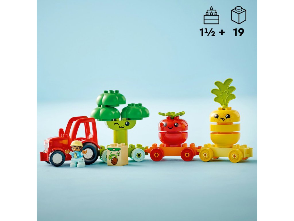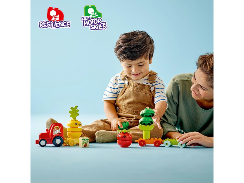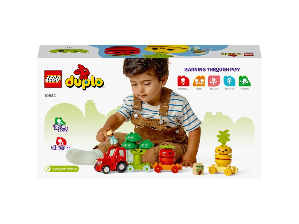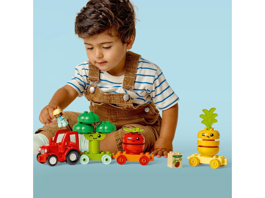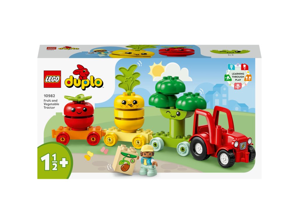 Stavebnice LEGO® DUPLO® Můj první traktor se zeleninou a ovocem (10982) přináší těm nejmenším spoustu způsobů, jak se učit. Děti budou pomáhat farmáři sklízet plodiny s traktorem se 3 přívěsy. Děti od 18 měsíců zdokonalí své motorické dovednosti a zjistí, jak se pěstuje zelenina a ovoce. Při skládáním kostek na sebe si mohou hrát na to, že plodiny „rostou“. Také si užijí zábavu při třídění podle barev, protože budou dávat rostliny do správných přívěsů. Malé děti však mohou zapojit i svou kreativitu a schopnost sebevyjádření, aby pomíchaly barvy podle sebe nebo změnily obličeje, jak se jim zlíbí!
