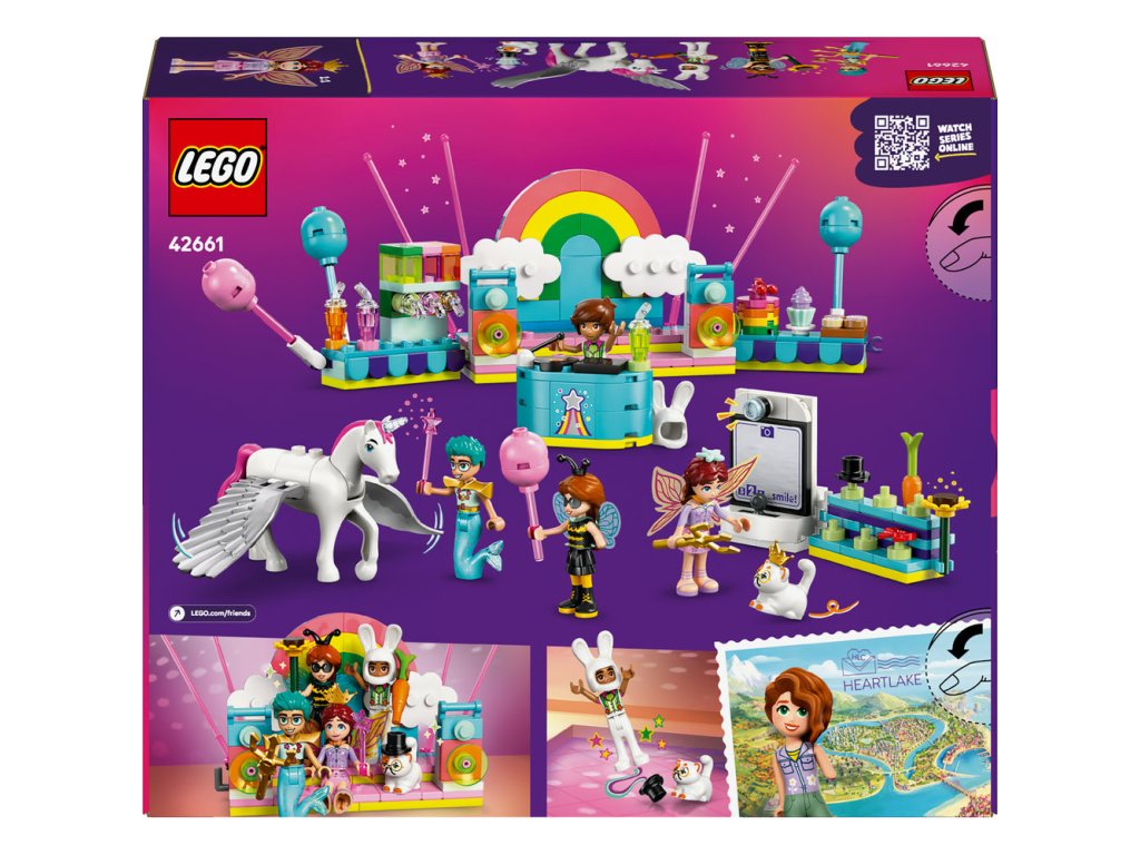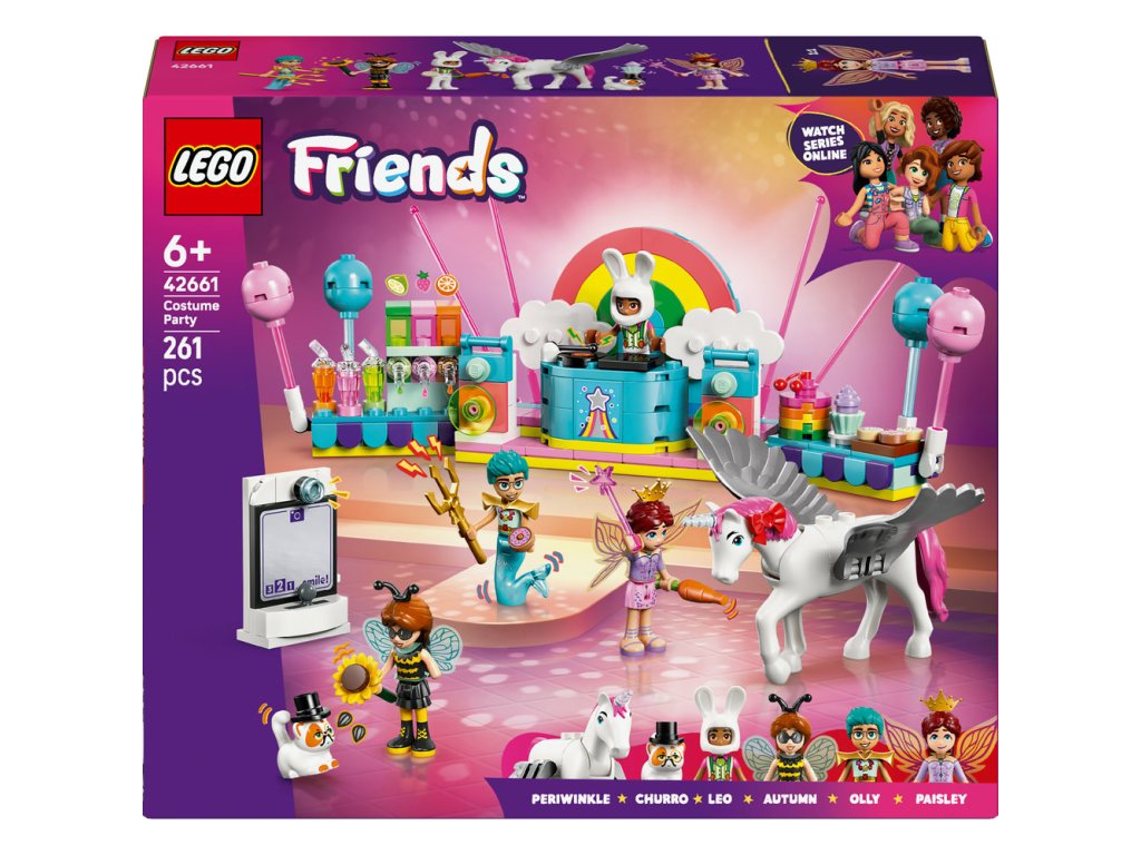 Stavebnice LEGO® Friends (42661) Kostýmová párty s jednorožcem a vílou pro holky a kluky od 6 let obsahuje 4 minipanenky LEGO Friends, figurku kočky a figurku koně a nechybí spousta roztomilých párty doplňků, které inspirují k zábavnému hraní. Děti si vymyslí vlastní zábavné příběhy a zahrají si na společenské situace s kamarády, kteří si zkoušejí kostýmy. Autumn je převlečená za čmeláka a Olly má kostým mořského muže. Připojí se k nim i kocour Churro v kostýmu kouzelníka a Leo v kostýmu králíčka. Paisley má na sobě kostým víly a kůň Periwinkle se promění v jednorožce. Kamarádi si užijí párty s pódiem, djským koutkem a občerstvením. Nechybí fotokoutek se zábavnými doplňky, kde kamarádi nafotí zábavné fotky! Objevte další skvělé hračky a dárky ze světa LEGO Friends (prodávají se samostatně). Tato stavebnice je kompatibilní s aplikací LEGO Builder, která přináší intuitivní stavitelské dobrodružství. V ní můžou děti přibližovat a otáčet modely a sledovat svůj postup při stavění.