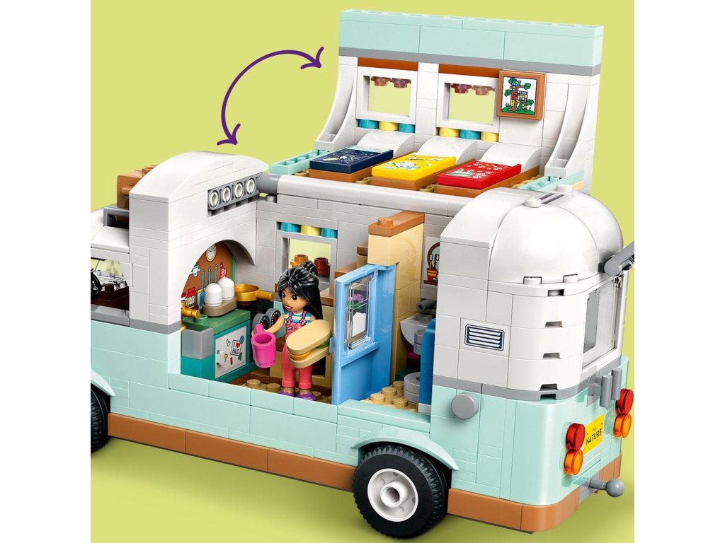 V této stavebnici karavanu pro děti najdete vše, co malí průzkumníci potřebují k vyprávění vlastních příběhů o kempování. Kamarádi sedí v kabině řidiče a hledají dokonalé místo na zaparkování v lese. Otevřete karavan a odhalte vybavenou kuchyň a toaletu. Zaručeně uslyšíte chichot, když děti uvidí, jak po „spláchnutí“ záchodu mizí odpad! Schody vedou do prostoru na spaní, kde je postel pro každou ze 3 minipanenek. Mezi další detaily patří kolo, na kterém mohou postavičky jezdit, piknikový stůl s židlemi, venkovní sprcha a kempingové doplňky včetně kompasu, klíče a dalekohledu.