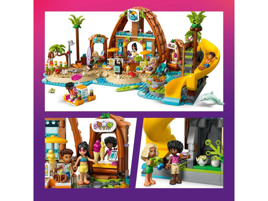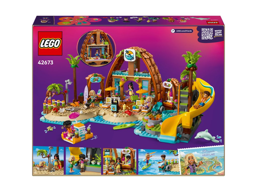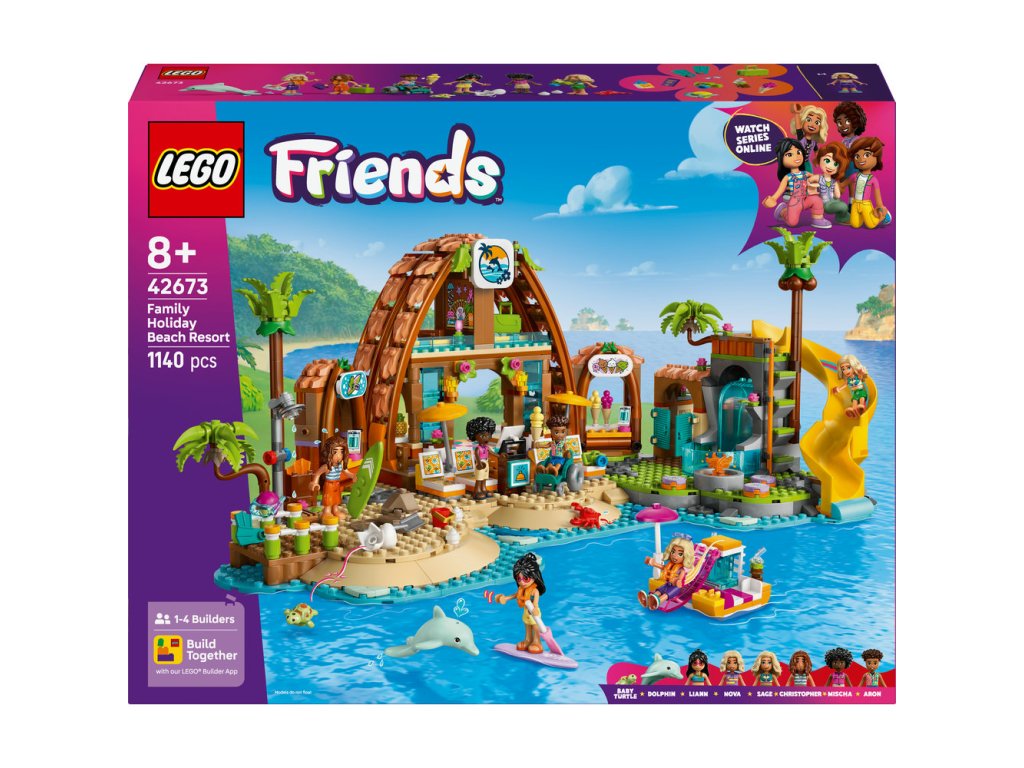 Užijte si rodinnou zábavu na dovolené s touto akční stavebnicí pro holky a kluky od 8 let. Stavebnice LEGO® Friends (42673) Rodinná dovolená u pláže je plná příběhů a obsahuje 6 minipanenek LEGO Friends, figurku delfína a želvy a doplňky pro kreativní hraní. Postavte letovisko a pak se vydejte na napínavé dobrodružství s plážovými aktivitami a vodními sporty. Najděte minci pomocí detektoru kovů, zahrabte postavičku do písku a užijte si klasickou plážovou rodinnou zábavu! Prozkoumejte půjčovnu s ploutvemi, šnorchly a surfovacími prkny. Objevte skrytou želví jeskyni, vyzkoušejte skluzavku nebo navštivte stánek se zmrzlinou a pak si odpočiňte u ohniště. Vymýšlení bude pokračovat uvnitř budovy, kde najdete ložnici a koupelnu. Objevte další kreativní hračky ze světa LEGO Friends (prodávají se samostatně). Stavějte společně s kamarády a rodinou – aplikace LEGO Builder nabízí zábavný zážitek ze společného stavění.