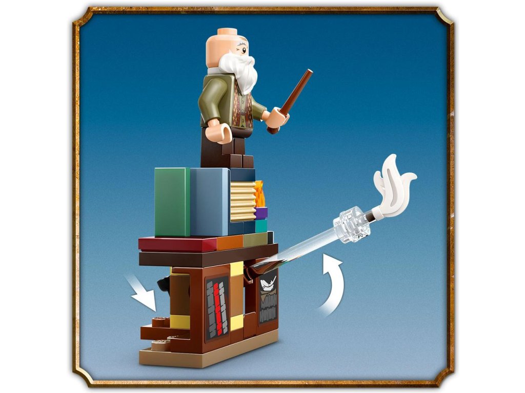 Model bradavické učebny lze rozložit pro snadné hraní. Místnost je vybavena funkcí levitace pírka pomocí kouzla Wingardium Leviosa, odnímatelnými lavicemi pro studenty, odnímatelnou tabulí s pokyny k čarování a dalšími funkcemi. Tato kouzelná stavebnice obsahuje také postavy LEGO Harry Potter – Rona Weasleyho, Hermionu Grangerovou a profesora Kratiknota –, se kterými se můžete pustit do vymýšlení nekonečných nápaditých příběhů.