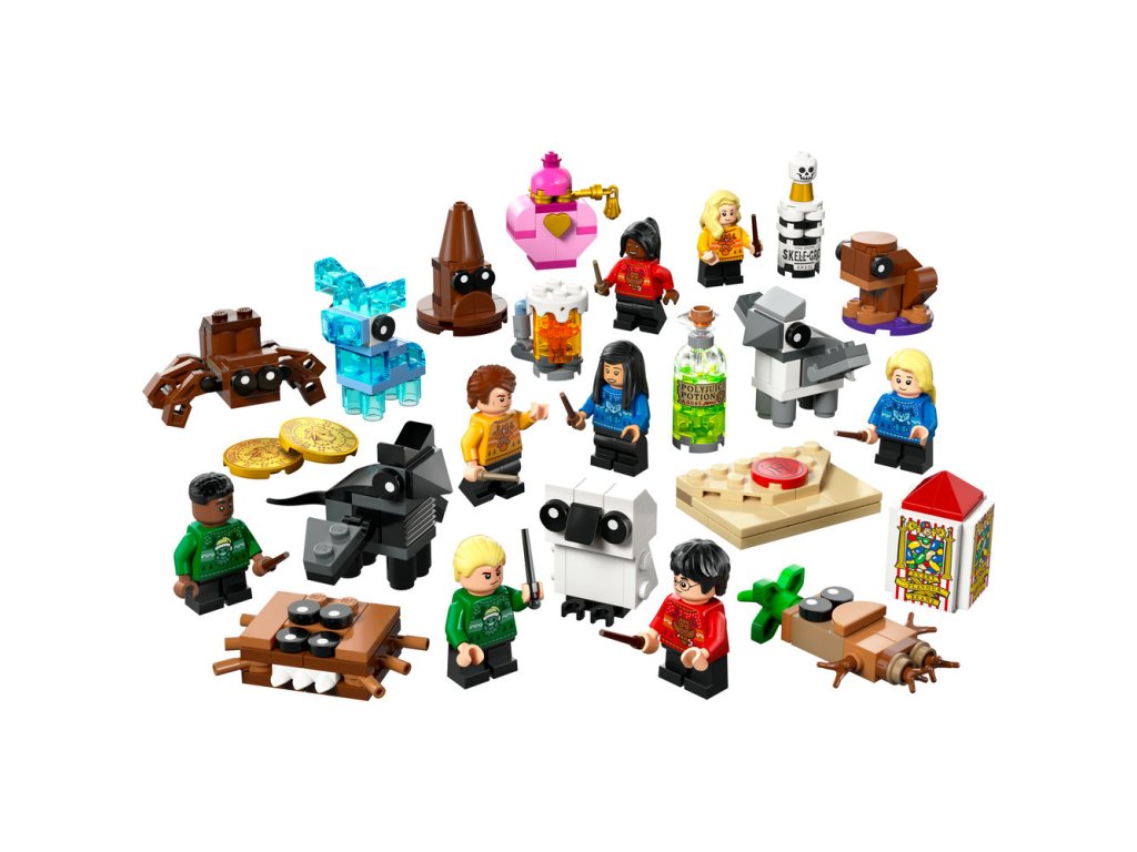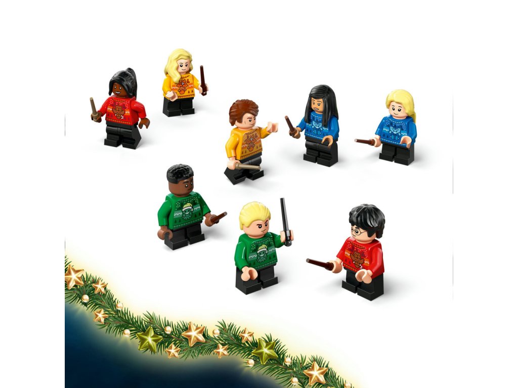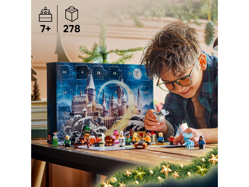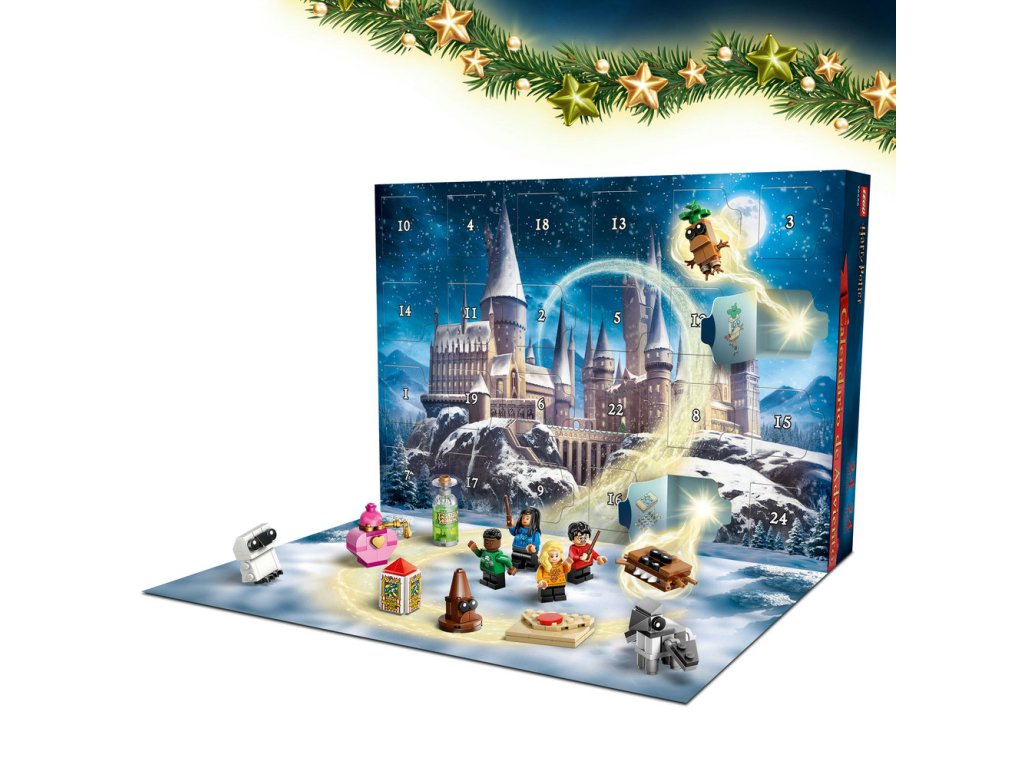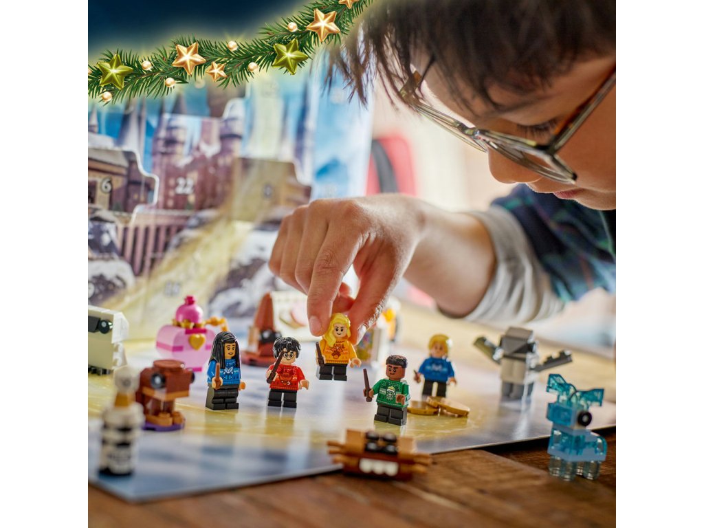 Adventní kalendář obsahuje figurky LEGO kouzelných tvorů, jako je Klofan, Aragog a patron v podobě jelena. Součástí je také 8 minifigurek oblíbených postav LEGO, včetně Harryho Pottera, Cho Changové, Draca Malfoye a Lenky Láskorádové, které na sobě mají bradavické vánoční svetry a v rukou hůlky. Nechybí spousta sběratelských mini modelů slavných předmětů, jako je dopis o přijetí do Bradavic, krabička Bertíkových fazolek tisíckrát jinak, Moudrý klobouk, řada kouzelných lektvarů a Obludné obludárium, se kterými si děti užijí ještě více herních možností. Model obsahuje 278 dílků.