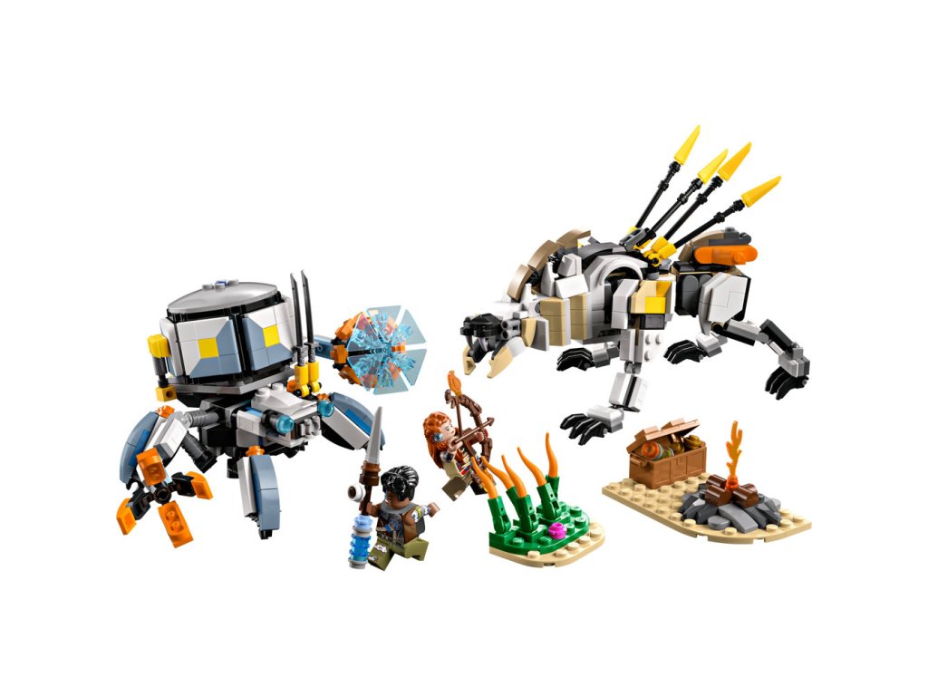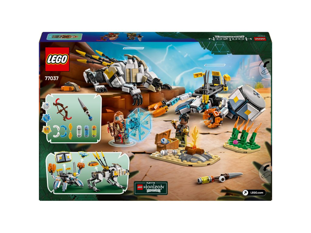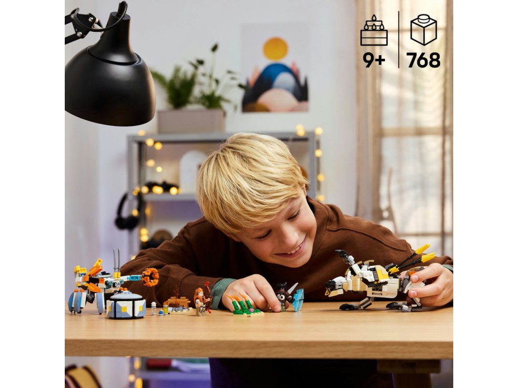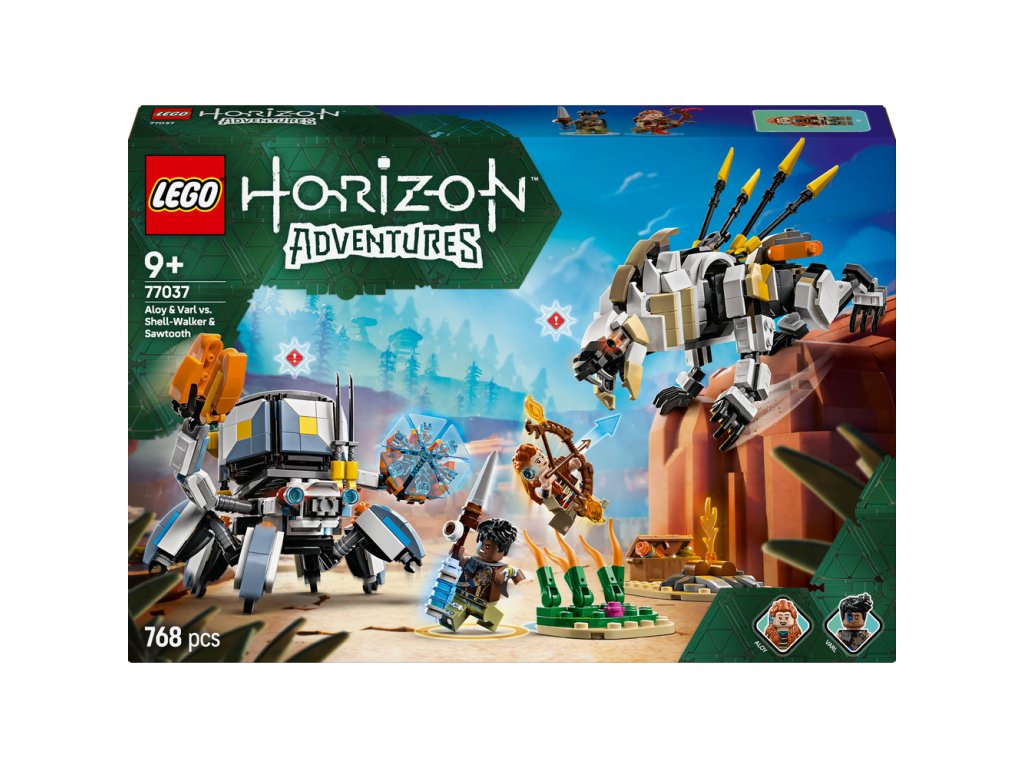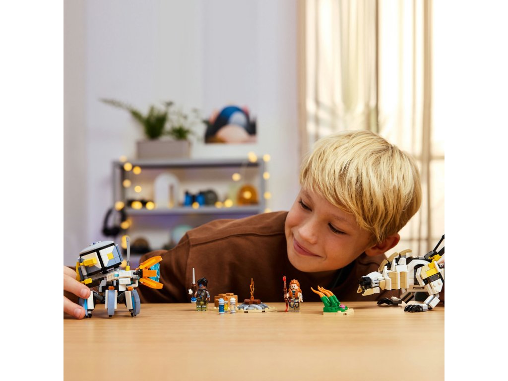 Tato herní stavebnice LEGO se mechanickými monstry je inspirovaná videohrou LEGO Horizon Adventures a obsahuje 2 minifigurky: Aloy a jejího věrného spojence Varla. Aloy má luk a Varl má oštěp. Obě zbraně mají vylepšení, které na ně lze přidat a aktivovat tak útok ohněm, chladem nebo šokem – stejně jako ve videohře. Součástí jsou také 2 sestavitelné robotické modely. Shell-Walker má pohyblivé nohy a ruce, otevírací drápy, odnímatelný nákladní modul a energetický štít. Plně pohyblivý Sawtooth má otevírací čelisti, otočný trup a pohyblivý krk, hlavu a nohy. Součástí stavebnice je také vysoké rákosí, tábořiště, truhla s pokladem a další vybavení, které inspiruje k nápaditému hraní. Užijte si ještě větší porci zábavy s aplikací LEGO Builder.