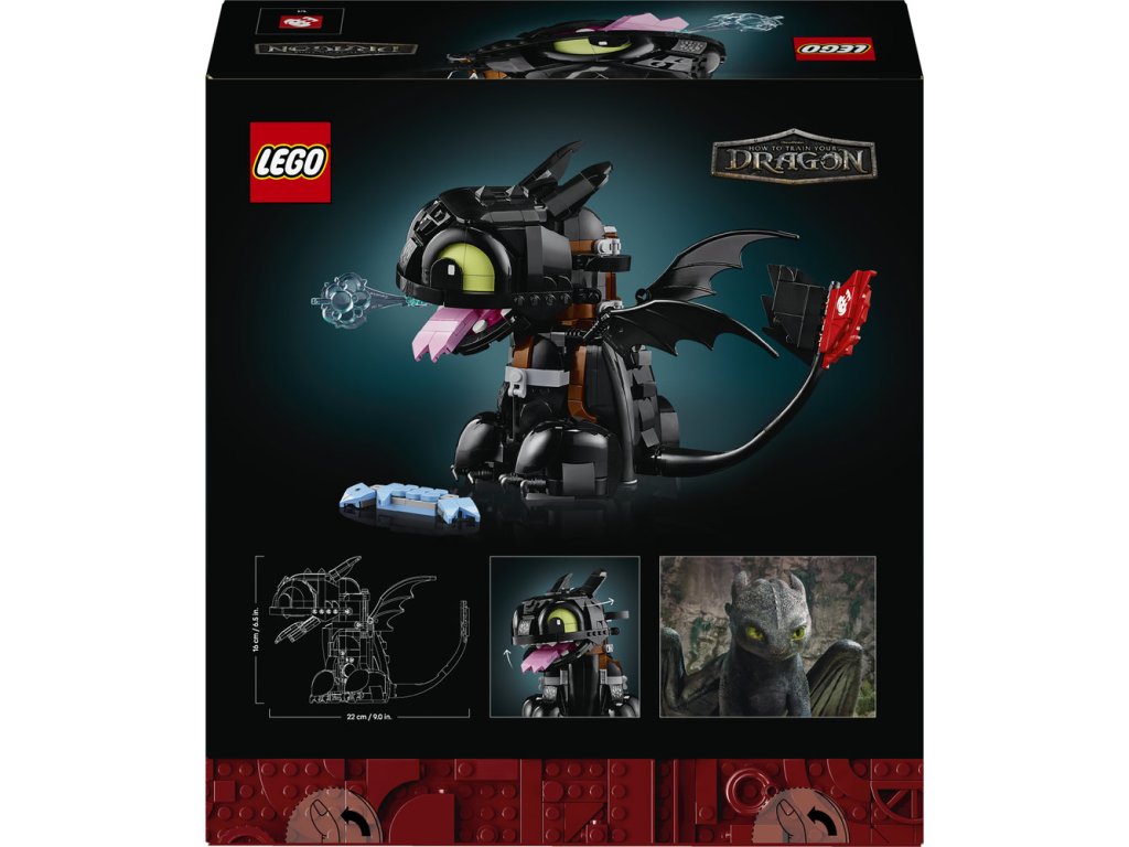 • Co najdete v krabici? – Vše, co potřebujete k sestavení pohyblivého modelu LEGO® Icons Jak vycvičit draka: Bezzubka, a doplněk v podobě ryby a plazmového výstřelu