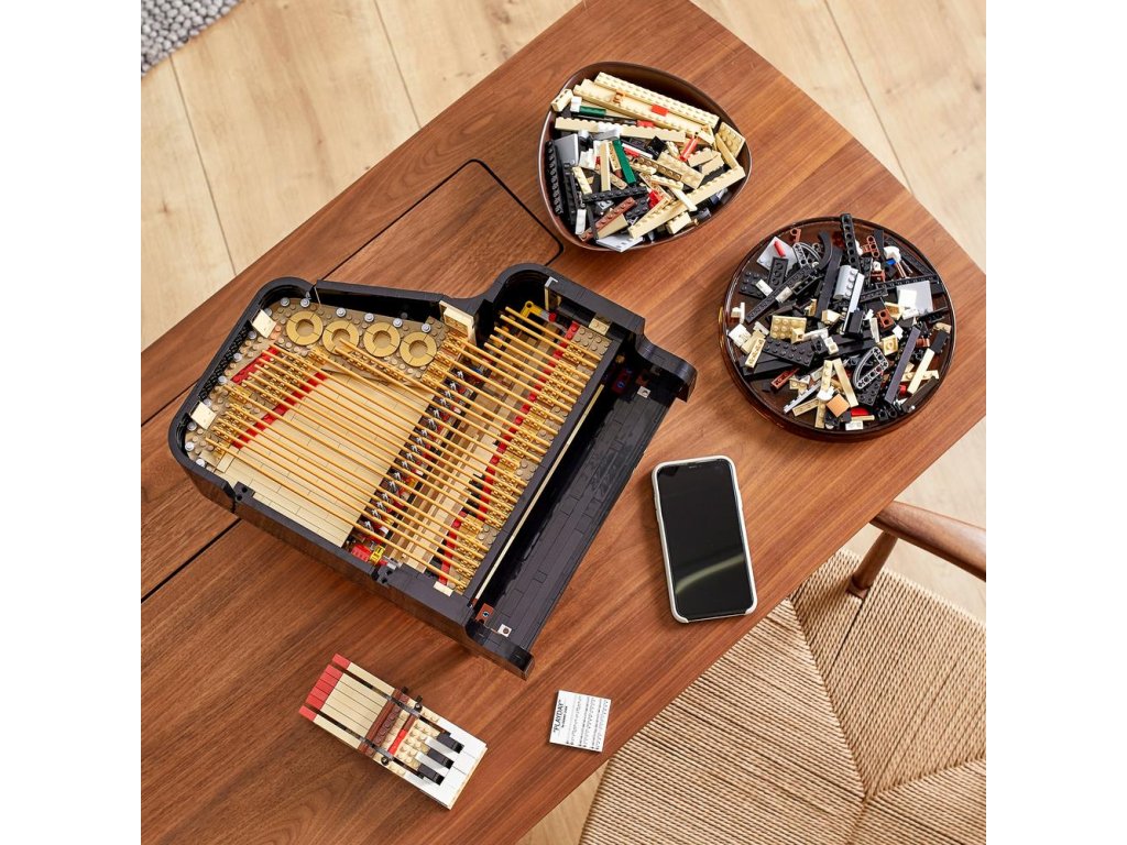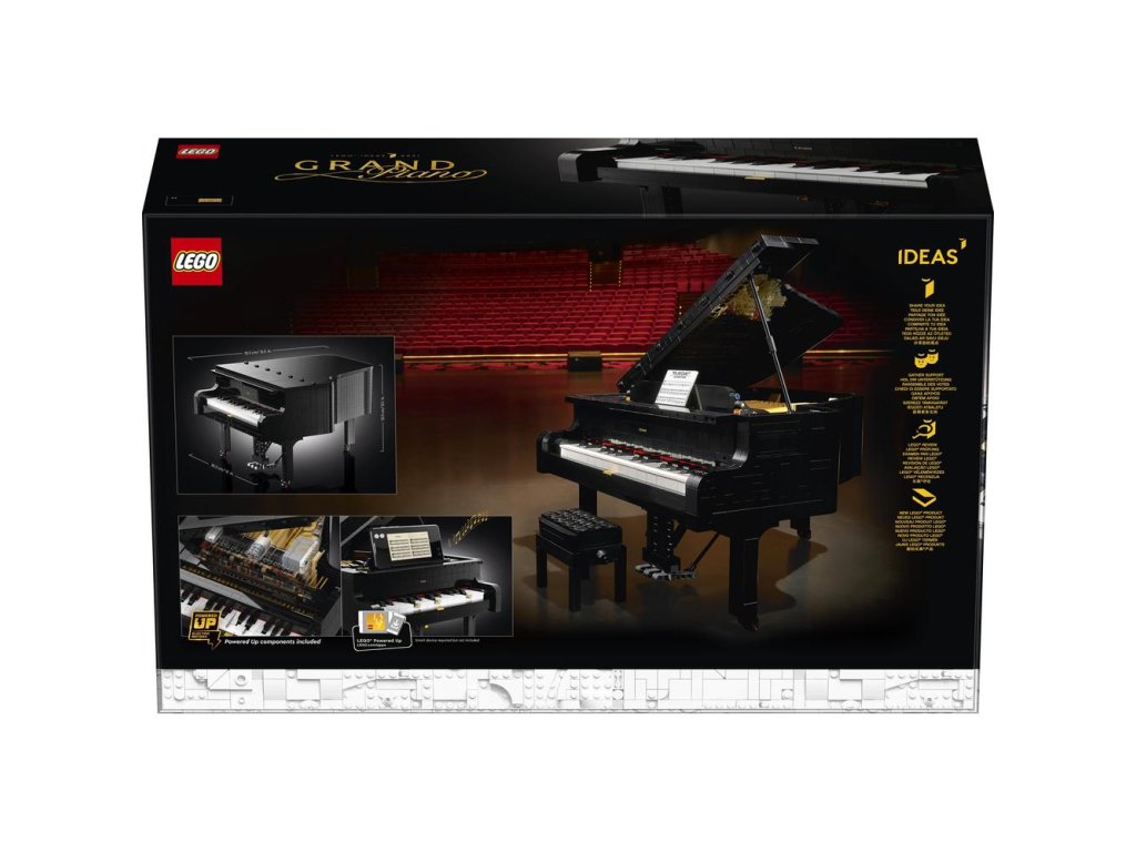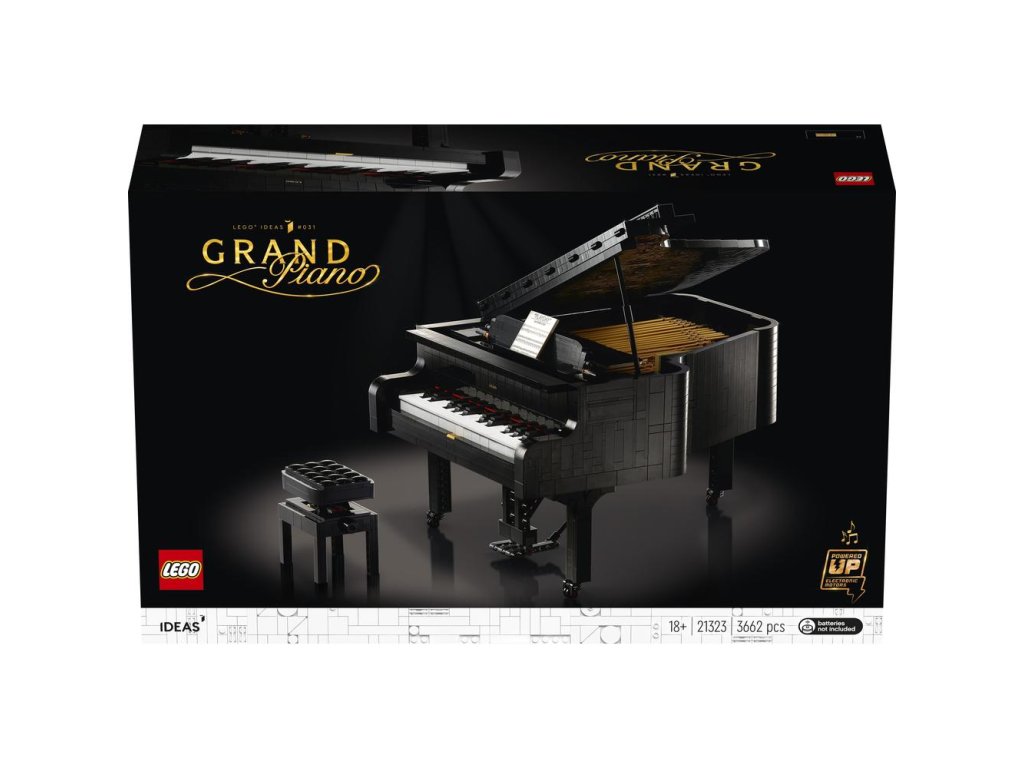 - Velké piano (21323) z řady LEGO® Ideas má odnímatelnou klaviaturu s 25 klávesami, autentické kladivo, pohyblivé tlumiče, pedál a motor. V kombinaci s aplikací LEGO Powered Up pak můžete ukázat svůj talent nebo si pustit automaticky přehrávanou melodii.