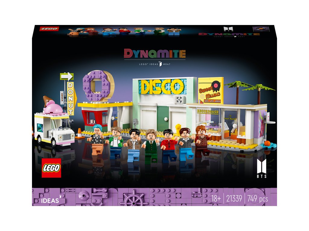 Zachyťte radostnou energii popových ikon 21. století se stavebnicí videoklipu BTS Dynamite od LEGO® Ideas (21339) – RM, Jin, SUGA, j-hope, Jimin, V and Jung Kook. Postavte si LEGO verze pestrobarevných scén z videoklipu k jejich multiplatinovému singlu Dynamite – diskotéku, obchod s hudebními deskami, obchod s donuty, zmrzlinářský vůz a další. Postavte všechny LEGO minifigurky BTS na různá místa nebo na odnímatelné pódium a otáčením kola je roztančete.