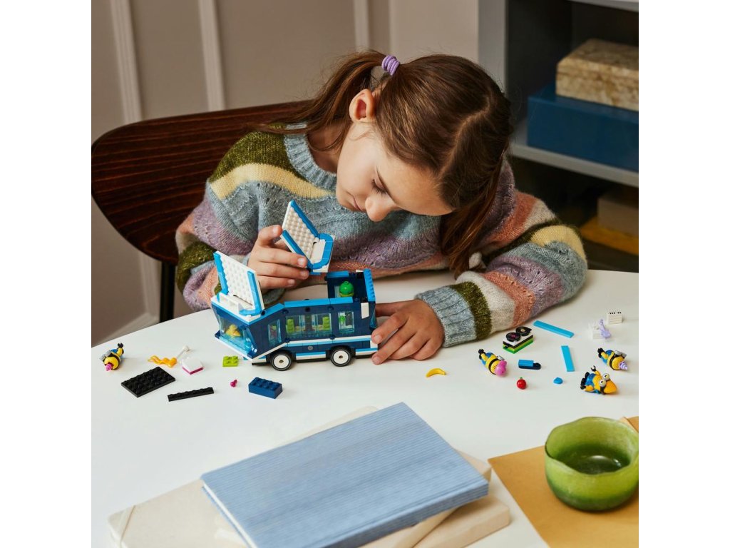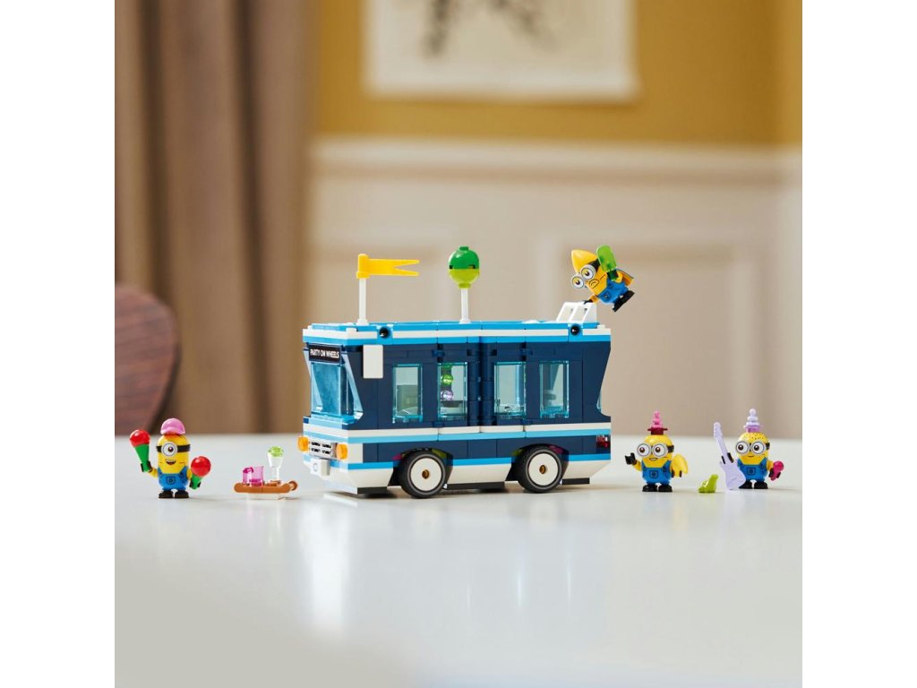 Ve stavebnici najdete 4 figurky mimoňů: Phila, Mela, Davea a létajícího mega mimoně Guse, který se poprvé objeví ve filmu Já padouch 4. Součástí autobusu je sedadlo řidiče a tyč na střeše, na kterou se zavěsí Gus. Otevřete boční strany a střechu autobusu a objevte taneční parket, mixážní pult, elektrickou kytaru, klavír, mikrofon, osvětlení, reproduktory a vířivku! Vyndejte jednotlivé prvky a pusťte se do hraní i mimo autobus. Tato zábavná stavebnice pro děti se pyšní výraznými barvami a najdete v ní úchvatné doplňky včetně vlaječky, balónku, zmrzliny, klobouků, nápojů, světel, reproduktorů a obrazovek. S aplikací LEGO Builder si děti navíc užijí digitální zábavu.