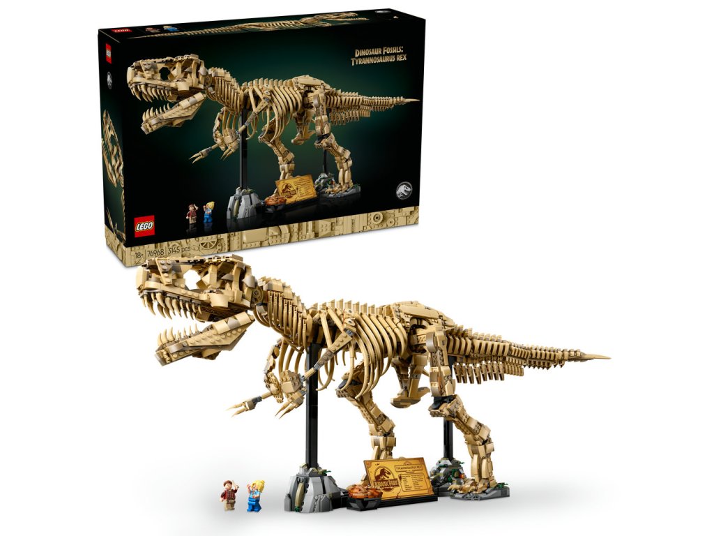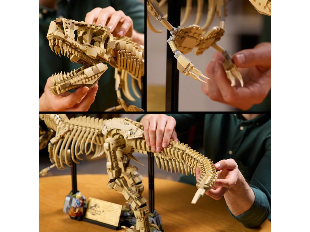 Ukažte světu svou lásku k dinosaurům s působivou výstavní stavebnicí Dinosauří fosilie: Tyrannosaurus rex (76968). Tento sběratelský model dinosaura LEGO® Jurassic World obsahuje fosilní kostru T-rexe v měřítku 1:12 s pohyblivými klouby včetně lebky, čelisti, pohyblivých paží a ocasu. Součástí je také informační cedulka, kterou lze připevnit na podstavec, skryté odkazy na filmy, jako je například dílek „jantaru“, a 2 minifigurky z filmu Jurský park z roku 1993: Ellie Sattlerová a Alan Grant.