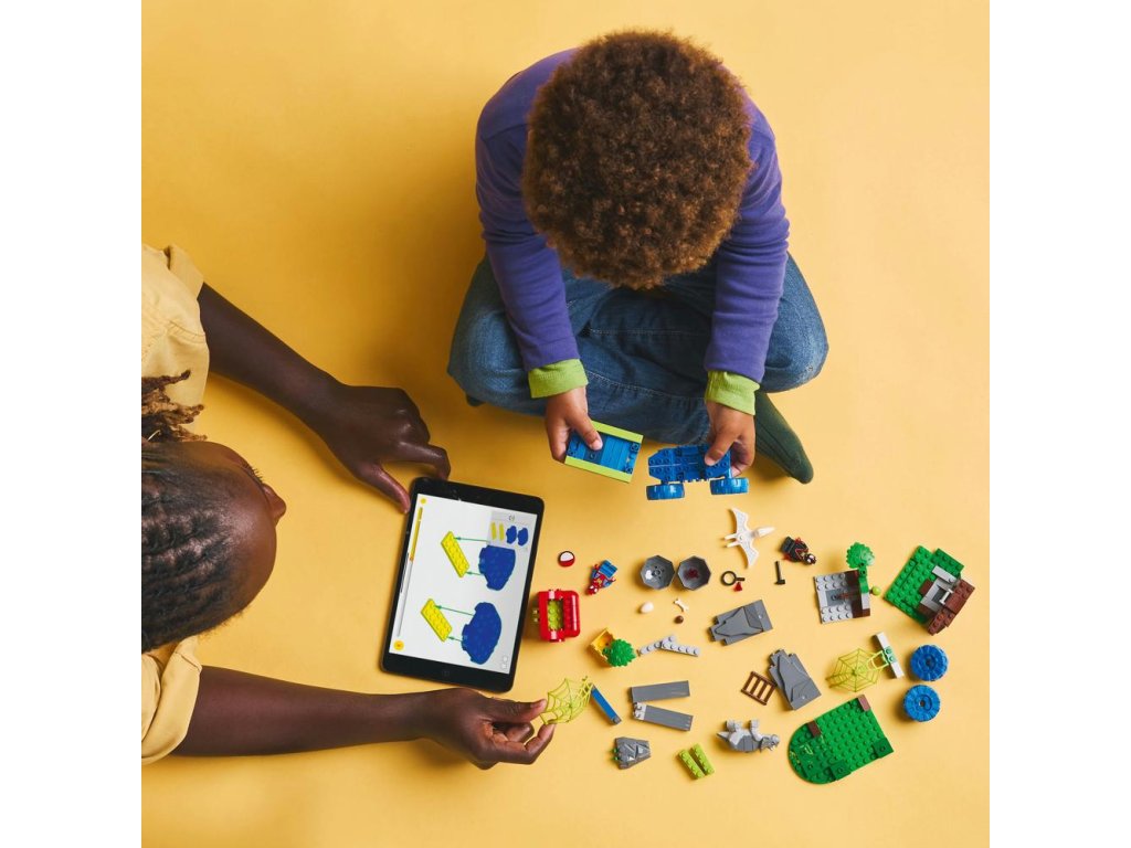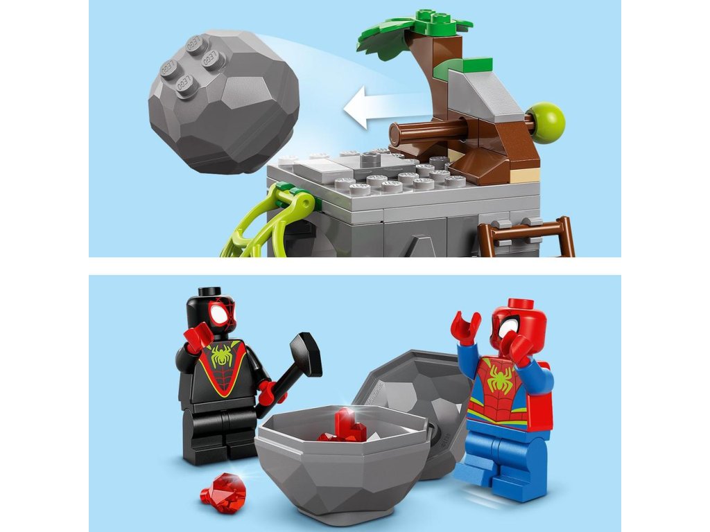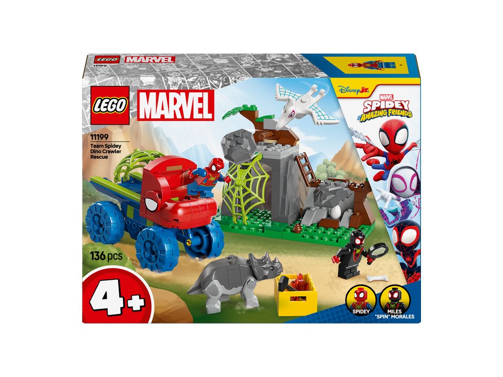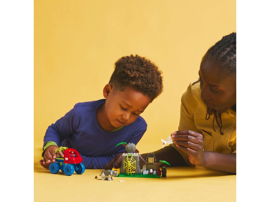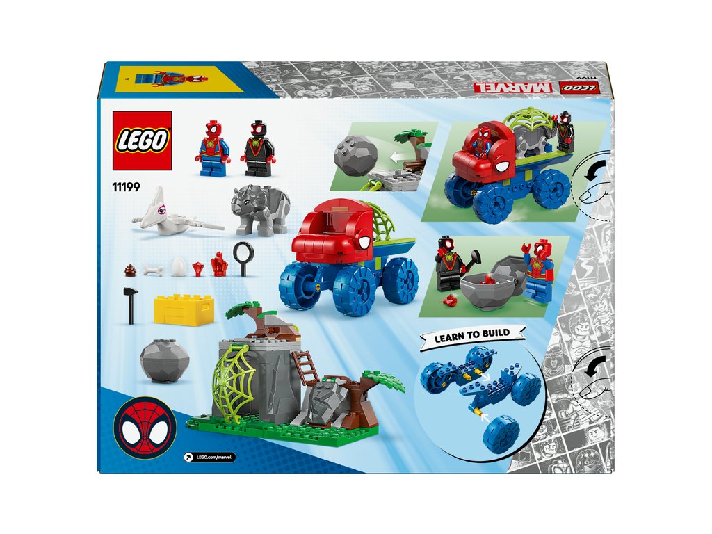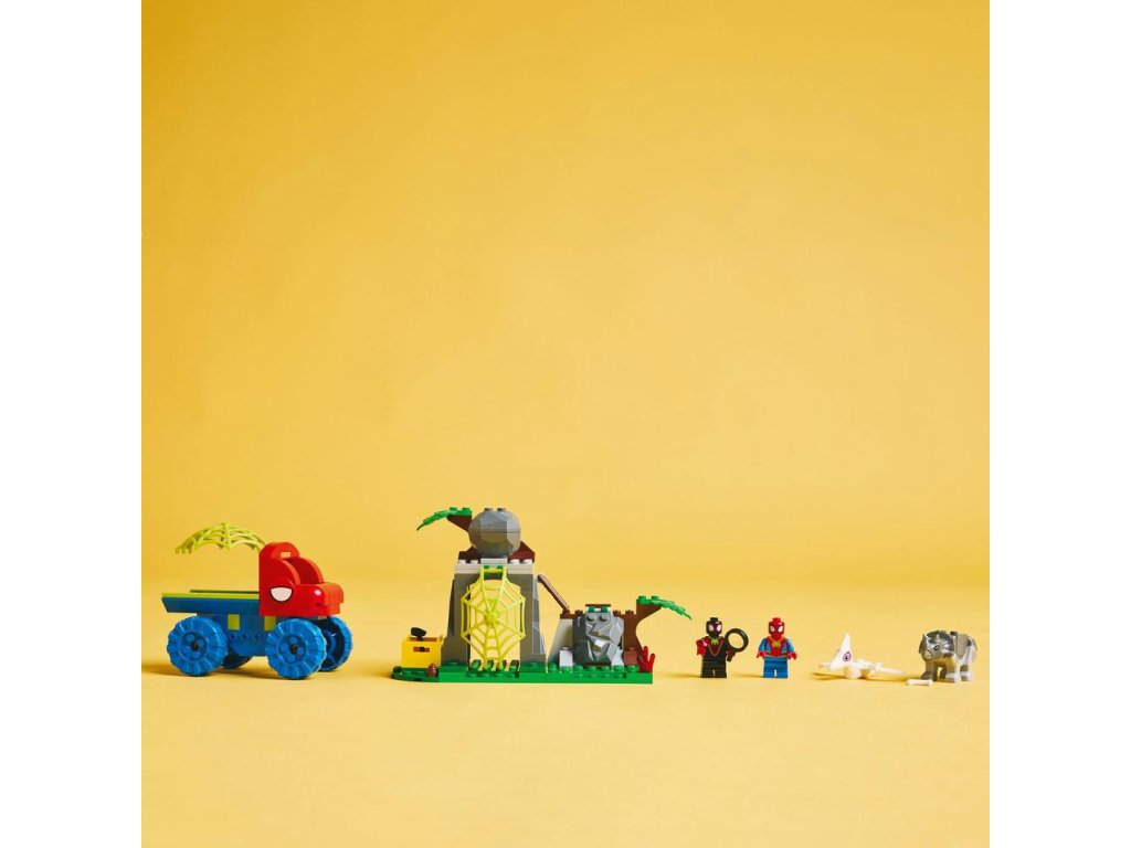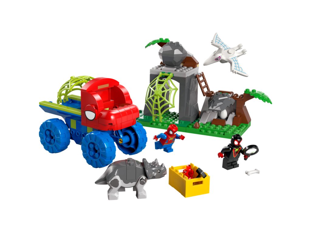 Tato stavebnice LEGO® obsahuje minifigurky Spideyho a Milese „Spin“ Moralese a 2 sestavitelné figurky dinosaurů: Ghost-Spider jako pterodaktyla a Rhina jako triceratopse. Součástí je také Spideyho truck LEGO s velkou pavučinou připevněnou k zadní straně, funkce padajícího kamene ovládaná spouští, dinosauří vejce, které je třeba odhalit, a pavučina, kterou můžete spustit a s její pomocí chytit padoucha do pasti. Nechybí intuitivní pokyny v podobě barevného obrázkového průvodce a samostatné sáčky s kostkami a velkou začátečnickou kostkou, se kterými se děti hned pustí do stavění.