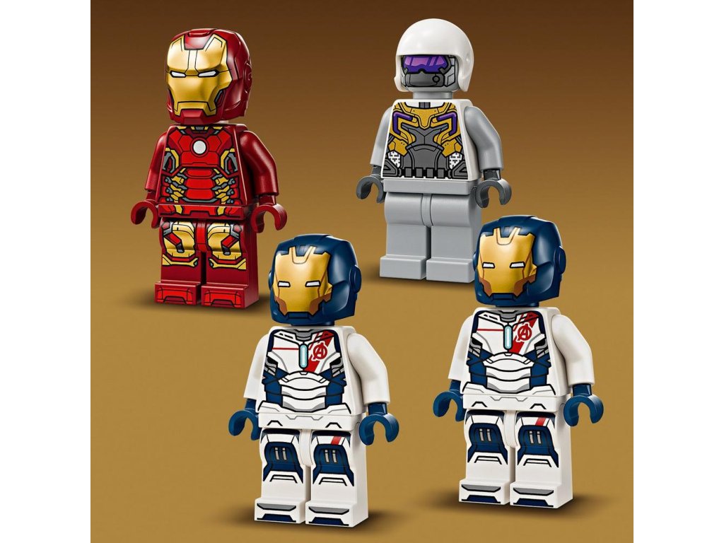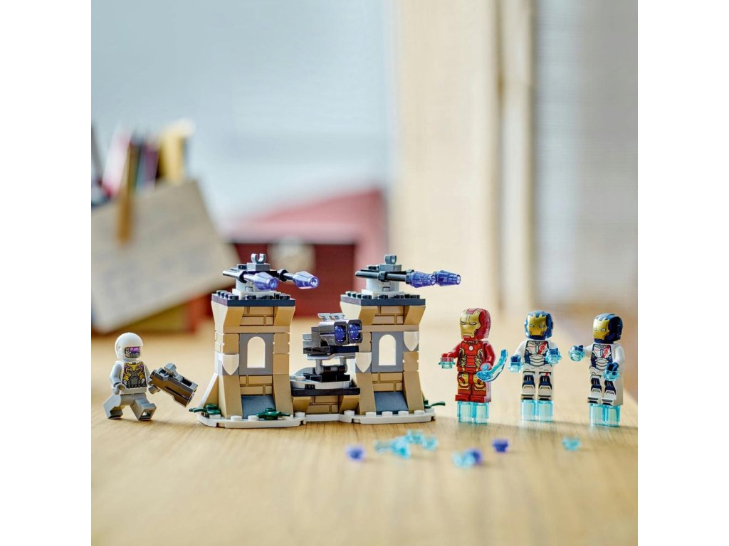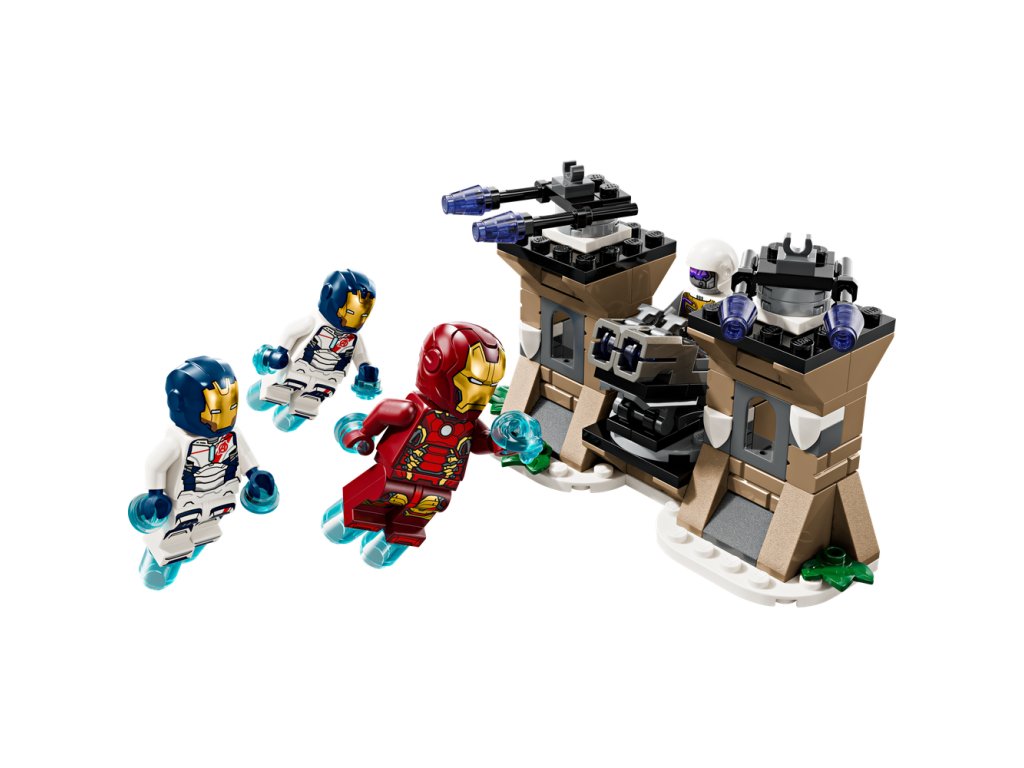 Stavebnice obsahuje 4 minifigurky: Iron Mana, 2 Železné legionáře, a vojáka Hydry. Sestavitelný model Iron Mana má otevírací hledí a drží energetický blaster. Voják Hydry má vystřelovač. Součástí jsou jasně modré kostky, které vytvářejí dojem, že minifigurky létají. Sestavitelný model základny Hydry zahrnuje 2 vystřelovače připevněné k otočné podlaze, kam mohou děti postavit vojáka Hydry, aby mířil na přicházející superhrdiny.Na vrcholu věží základny jsou 2 páry odpalovačů raket (nestřílejících) k odvrácení útoku. K doplňkovým digitálním funkcím se dostanete prostřednictvím aplikace LEGO Builder.
