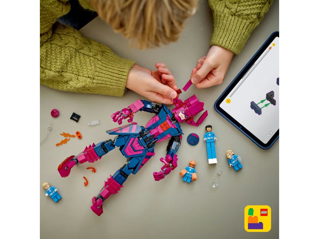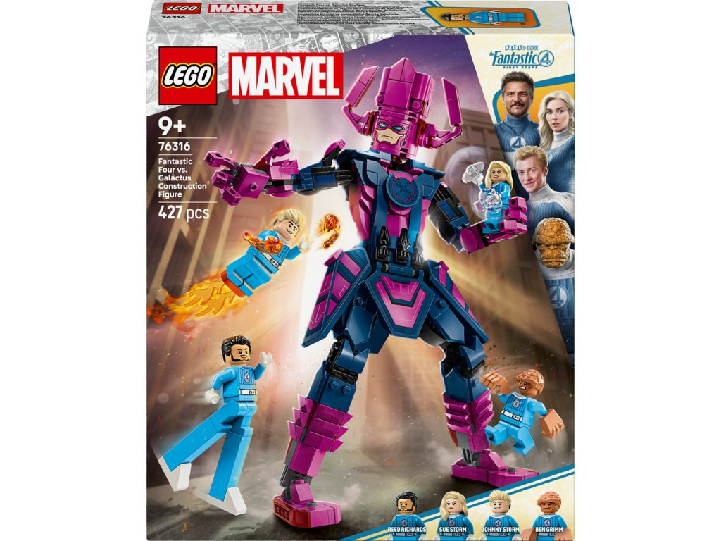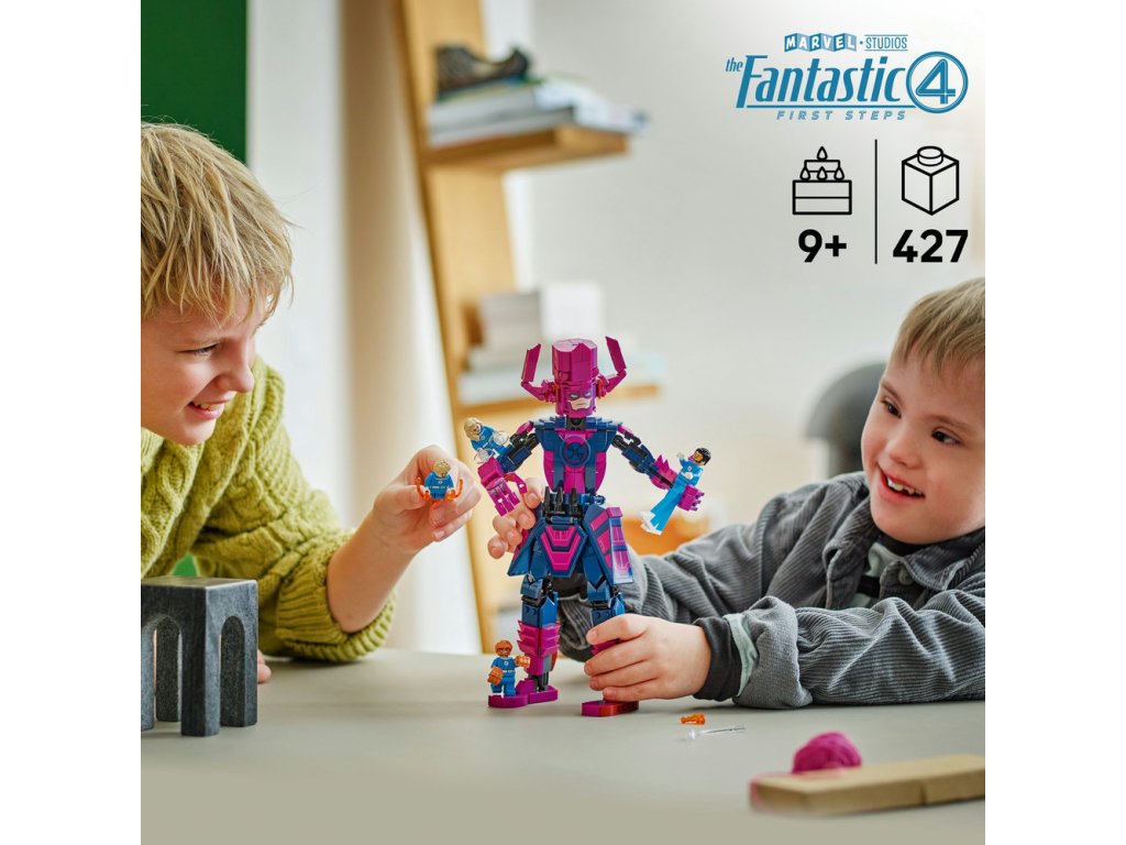Fanoušci filmu Fantastická čtyřka: První kroky od studia Marvel si zinscenují akční momenty z filmu se stavebnicí LEGO® ǀ Marvel (76316) Fantastická čtyřka vs. sestavitelná figurka Galactuse, vůbec první stavebnicí LEGO s Fantastickou čtyřkou! Tato hravá stavebnice LEGO ǀ Marvel poslouží jako působivý dárek pro kluky a holky od 9 let, kteří milují superhrdinská dobrodružství. Tato stavebnice LEGO ǀ Marvel Fantastická čtyřka obsahuje 4 minifigurky: Součástí je Mr. Fantastic s výsuvnýma nohama, Human Torch se 2 ručními blastery, dílky v podobě plamenů připevněných k nohám a průhlednou podpěrou, která mu umožňuje „létat“, Invisible Woman se 2 silovými štíty a Thing s velkýma a mocnýma rukama. Plně pohyblivá figurka ikonického filmového padoucha Galactuse měří přes 28 cm na výšku. Tato pohyblivá figurka nastartuje nekonečné akční souboje se superhrdiny. Pro ještě větší digitální zábavu si stavitelé můžou přibližovat a otáčet modely ve 3D a sledovat svůj pokrok pomocí zábavné a intuitivní aplikace LEGO Builder. Model obsahuje 427 dílků.