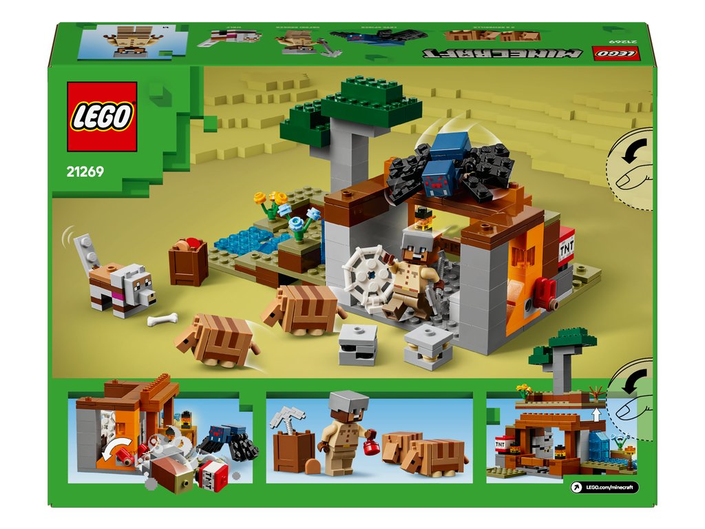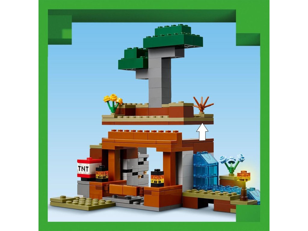 Model se odehrává v herním biomu savany a součástí je minu s pákou, která ovládá funkci dynamitu. Ten odstřelí kus terénu a odhalí vzácnou rudu. Nechybí jeskynní pavouk, vlk a 2 pásovci, ze kterých získáte šupiny na výrobu vlčího brnění. Na okraji dolu se nachází říčka a lávový vodopád. Stavebnici lze snadno přeskládat a vydat se na nová dobrodružství. Pro ještě větší digitální zábavu umožňuje aplikace LEGO Builder dětem přibližovat a otáčet modely ve 3D pomocí jejich zařízení.