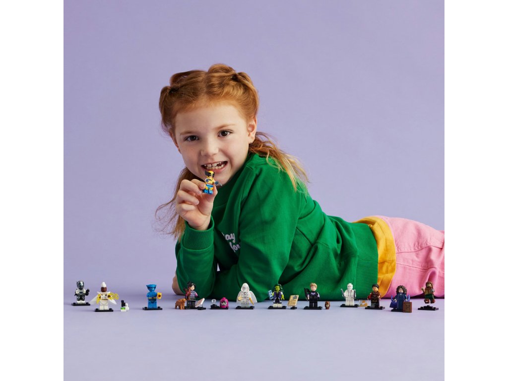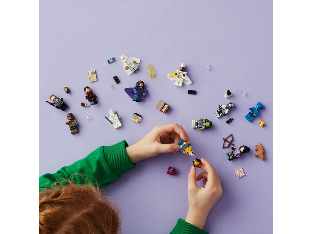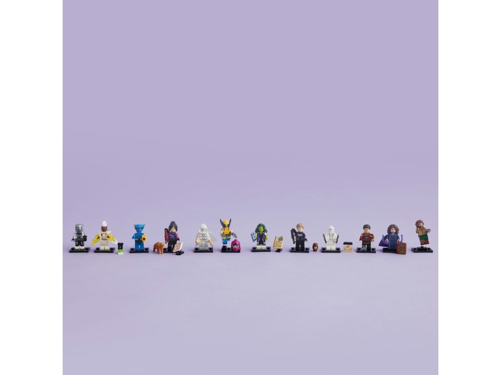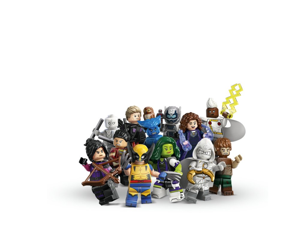 Malí stavitelé budou s nadšením otevírat balíčky z udržitelného materiálu, které ukrývají postavy ze světa Marvel. V sadě je celkem 12 jedinečných postav: Agatha Harkness, Kate Bishop, Hawkeye, Moon Knight, pan Knight, She-Hulk, Werewolf, Goliath, Storm, Beast, Wolverine a Echo.