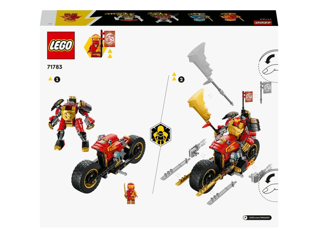 Malí stavitelé od 7 let a fanoušci parádních strojů si budou s akční stavebnicí Kaiova robomotorka EVO (71783) přehrávat své vlastní souboje dobra proti zlu. K dispozici budou mít pohyblivého robota a parádní motorku, kterou lze vylepšit na ještě výkonnější stroj s pomocí zlatých bočních panelů a obrovské zlaté čepele.