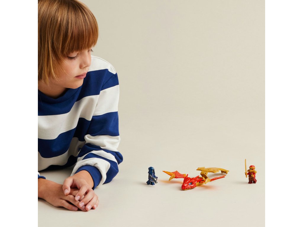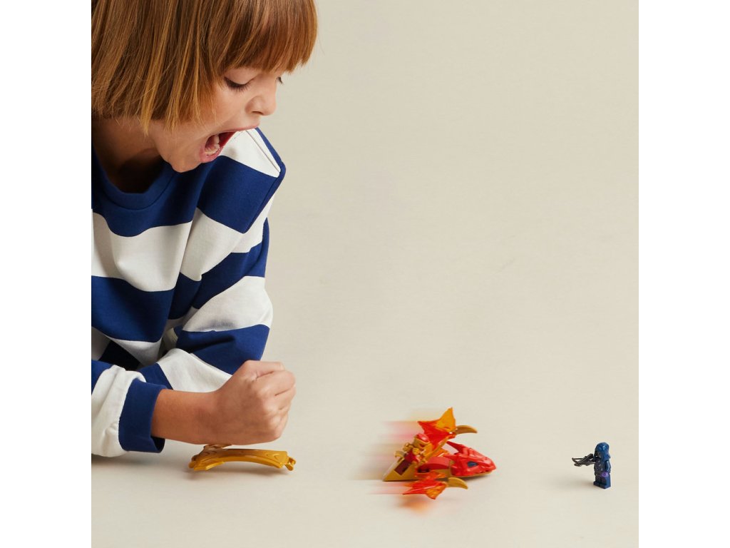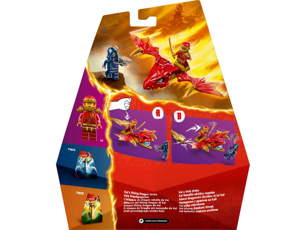 Děti od 6 let se stavebnicí Kai a útok draka (71801) z kostek LEGO® znovu prožijí dobrodružství z 2. řady televizního seriálu NINJAGO® Dračí povstání. Malí stavitelé si tuto akční hračku draka LEGO NINJAGO , první svého druhu, přímo zamilují – sklopí zlatý ocas draka a budou sledovat, jak se pouští do akce.