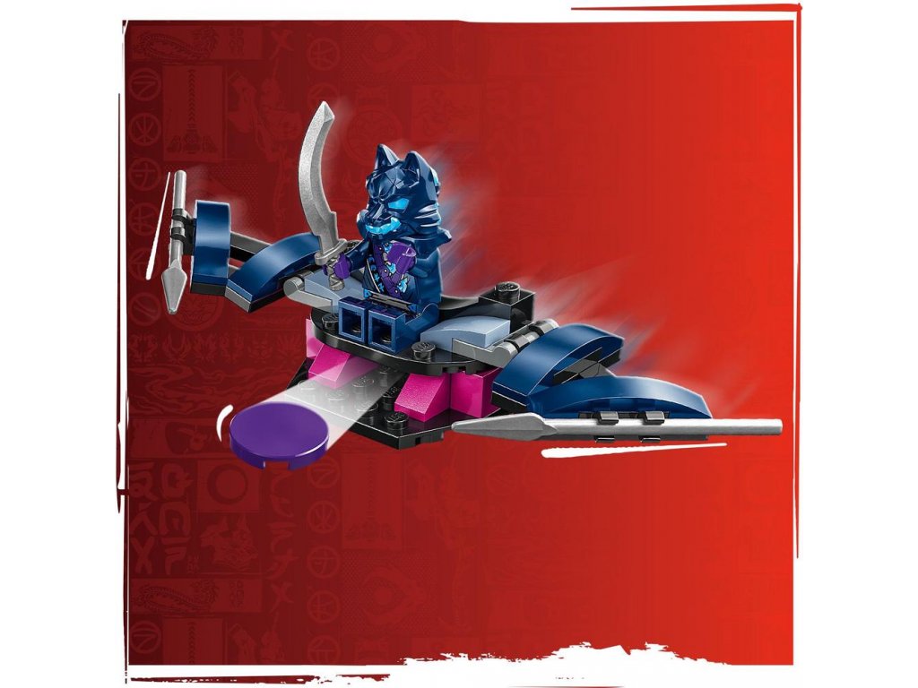 Součástí této stavebnice LEGO® jsou 2 minifigurky: Arin s katanou a válečník s vlčí maskou s mečem. Arin se vejde do pohyblivého robota s velkým mečem a otáčející se čepelí a válečník s vlčí maskou dokáže létat na kluzáku s pohyblivými křídly, vystřelovačem disků a 2 oštěpy. Nechybí ani křišťálová jeskyně z kostek, ve které najdete palici roztříštění a stojan na zbraně se 2 zlatými katanami.