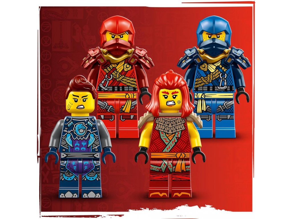 Součástí nindžovské hračky jsou 4 minifigurky NINJAGO: Lezec Kai a lezec Jay s katanami, Wyldfyre se 2 ohnivými pěstmi a zlá Jordana s kluzákem.
