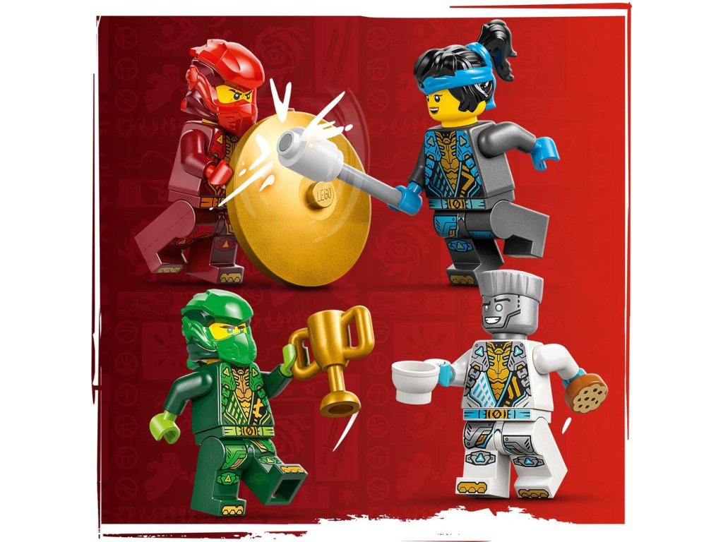 Tato stavebnice LEGO obsahuje 4 minifigurky NINJAGO: Zanea, Nyu, Kaie a Lloyda, a navíc Riyu jako mládě, se kterými si děti připomenou akční nindžovské scény. Minifigurky lze umístit na 2 otáčecí desky pro velkolepé bitvy. Užijte si ještě větší porci zábavy se spoustou doplňků: Nindžovskými zbraněmi včetně 2 mečů a 3 holí, kladivem, ptákem, žábou, trofejí, sušenkou a dopisem.