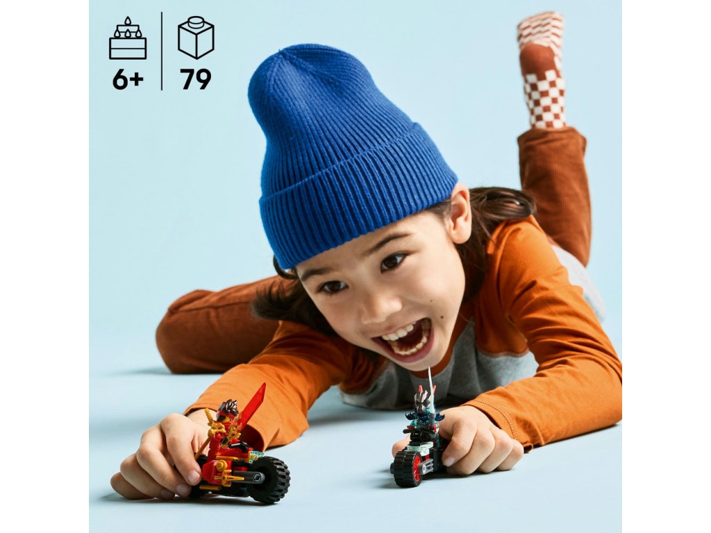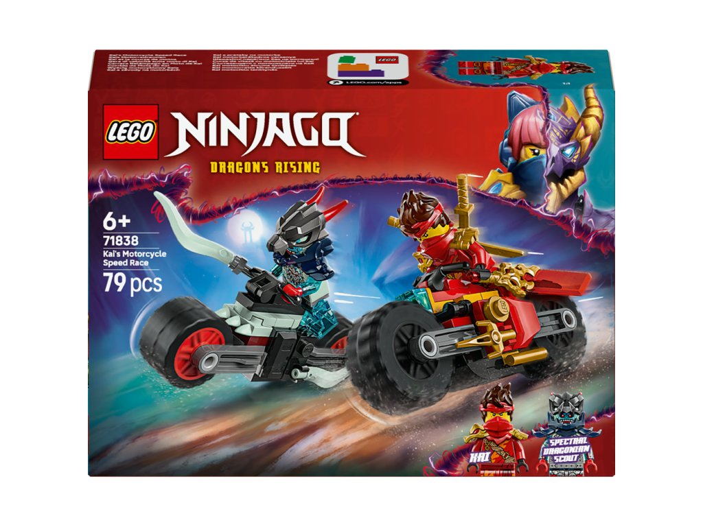 Se stavebnicí Kai a závody na motorkách (71838) si kluci a holky od 6 let připomenou akční scény z 3. řady televizního seriálu NINJAGO® Dračí povstání. Tato akcí nabitá stavebnice obsahuje 2 nindžovské motorky s pohyblivými koly: Kaiovu závodní motorku ozdobenou 2 dýkami a démonickou motorku Přízračného dračího zvěda. Tato nindžovská stavebnice obsahuje 2 minifigurky NINJAGO, které můžou řídit motorky: Kaie vyzbrojeného průsvitnou odhalující čepelí a 2 zlatými katanami a Přízračného dračího zvěda s mečem. Děti si s touto stavebnicí užijí hodiny kreativního hraní na bitvy dobra proti zlu, ať už sólo nebo s kamarády. V dalších stavebnicích z řady LEGO® NINJAGO se sestavitelnými hračkami s nindžovskou tematikou najdete draky, vozidla a chrámy a fanoušci si užijí hodiny zábavného hraní se svými oblíbenými hrdiny. Aplikace LEGO Builder vám a vašemu dítěti ukáže snadnou a intuitivní cestu stavitelským dobrodružstvím pro skládání nindžovského modelu. Stavebnice obsahuje 79 dílků.