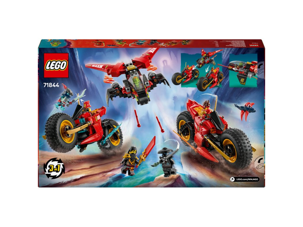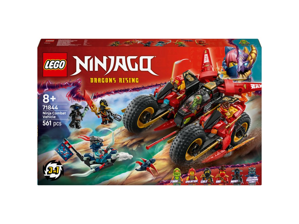 Děti od 8 let si se stavebnicí Bojového vozidla 3 v 1 (71844) připomenou scény z 3. řady televizního seriálu NINJAGO® Dračí povstání. Děti si můžou hrát s velkou akční figurkou nindžovské motorky a pak ji rozdělit na 3 menší vozidla: Kaiovu motorku, Wyldfyreinu motorku a Frakovu stíhačku se 2 vystřelovači. Tato stavebnice LEGO® obsahuje 6 minifigurek: Kaie, Wyldfyre a poprvé i Fraka, z nichž každá má 2 zlaté katany, Colea s průsvitnou odhalující čepelí a Nokta a Přízračného dračího zvěda, z nichž má každý jeden meč, a k tomu navíc model kluzáku a malého tvora. Zlotřilá dvojice má také vlajku s tajnou zprávou, kterou dokáže odhalit pouze Coleova průsvitná odhalující čepel. V dalších stavebnicích z řady LEGO NINJAGO najdete draky, vozidla a chrámy a fanoušci si užijí hodiny zábavného hraní se svými oblíbenými hrdiny. Aplikace LEGO Builder vám a vašemu dítěti ukáže cestu stavitelským dobrodružstvím pro skládání nindžovského modelu. Stavebnice obsahuje 561 dílků.