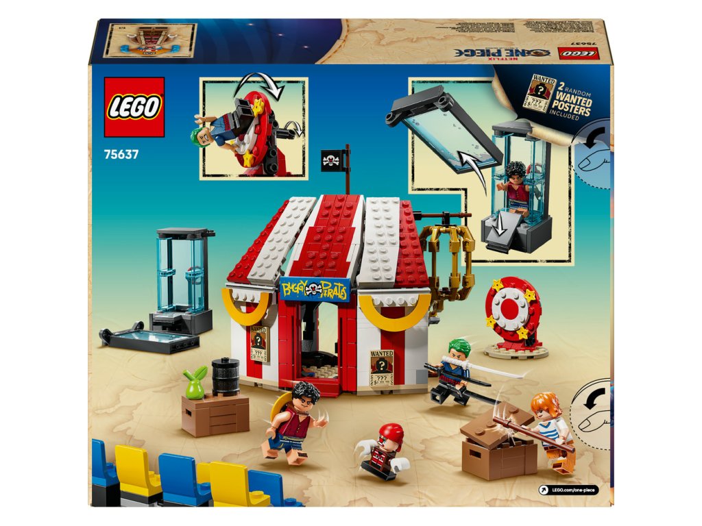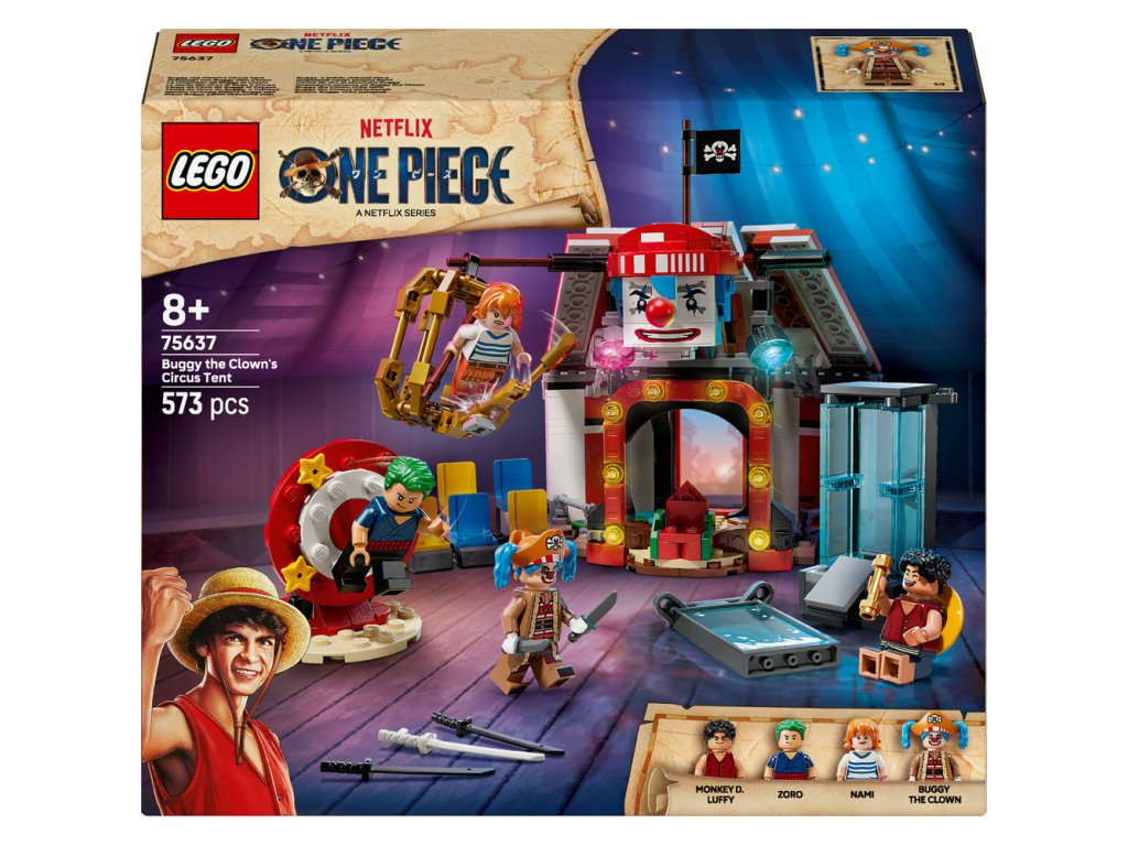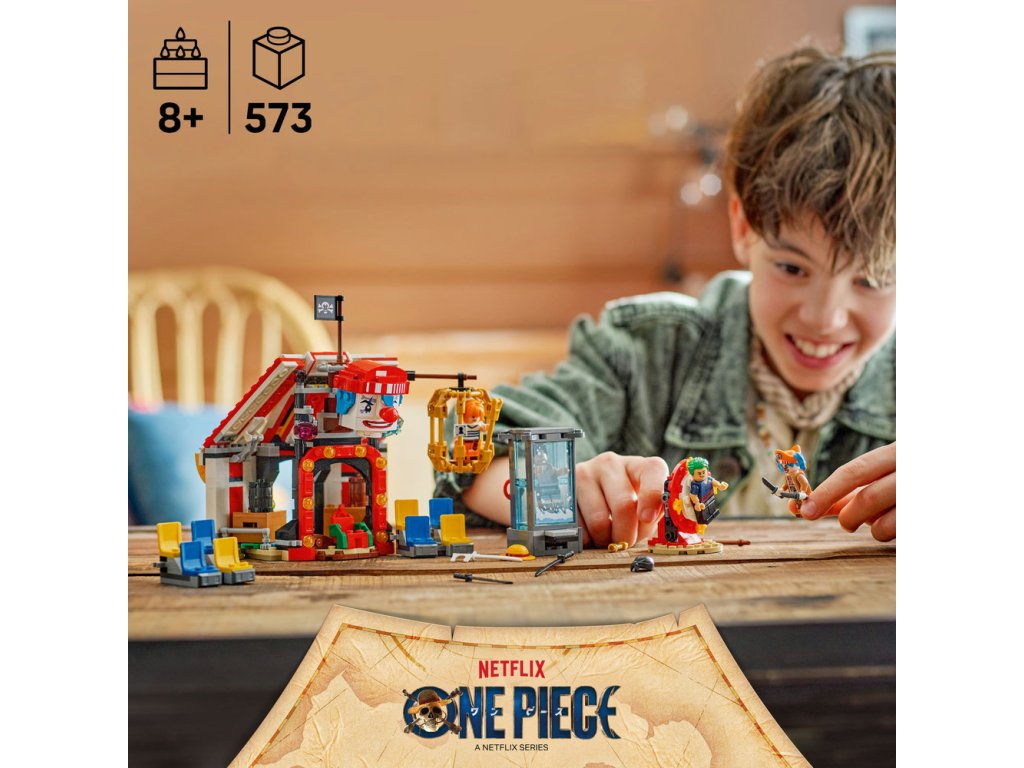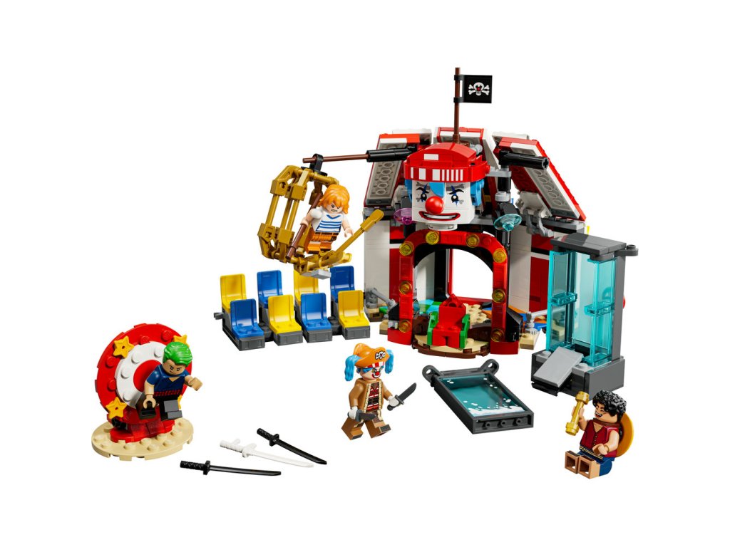 Součástí stavebnice jsou minifigurky Luffyho, Zora, Nami a pirátského kapitána Klauna Buggyho. Sestavitelný stan lze otočit a vytvořit tak větší hrací plochu s odnímatelnými částmi s židlemi a Buggyho trůnem. Součástí jsou také 3 cirkusové pasti, ze kterých musí hrdinové uniknout: nádrž na vodu, otáčející se terč a závěsná klec. Uvnitř stanu najdete krabice a sudy s dílky, ze kterých lze postavit menší verzi Buggyho. Nechybí spousta skvělých zbraní a doplňků, včetně 2 plakátů hledaných osob. Pro ještě větší porci digitální zábavy můžou stavitelé přibližovat a otáčet modely ve 3D a sledovat postup stavění pomocí intuitivní aplikace LEGO Builder. Stavebnice obsahuje 573 dílků.