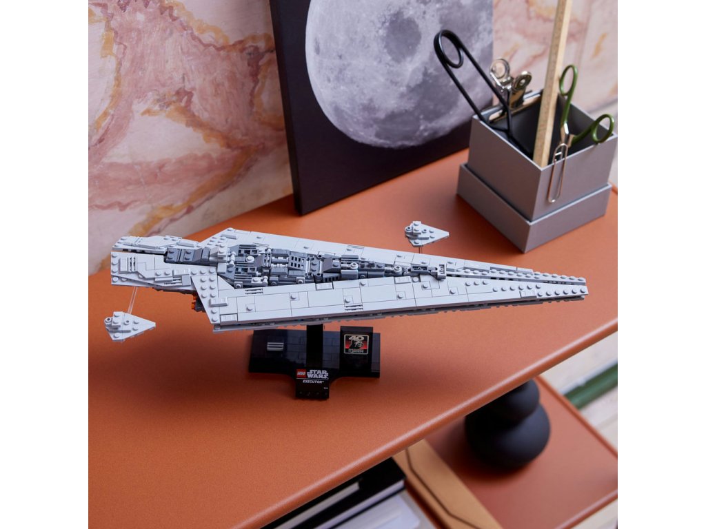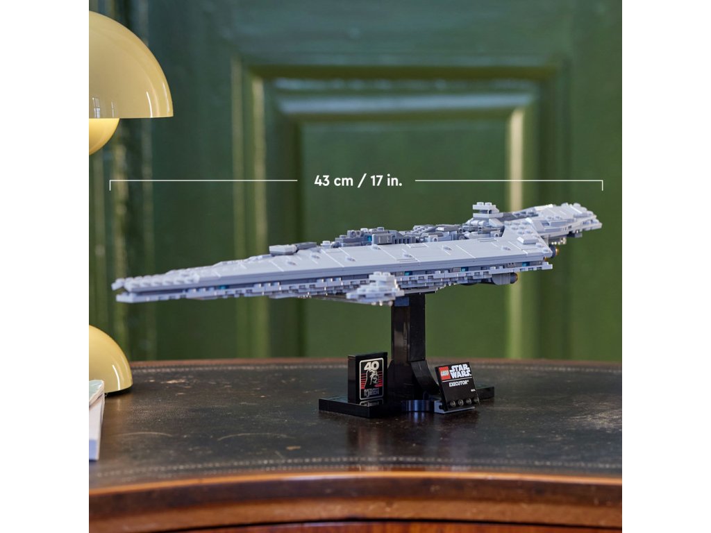 Hvězdný superdestruktor Executor můžete umístit na podstavec na vystavení, jehož součástí je cedulka a plaketka ke 40. výročí filmu Star Wars: Návrat Jediho. Loď na výšku měří přes 43 cm a má ideální velikost pro vystavení na stole nebo na polici.