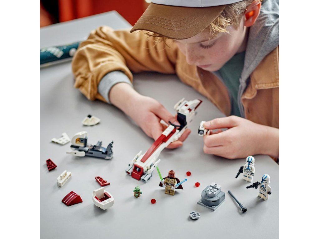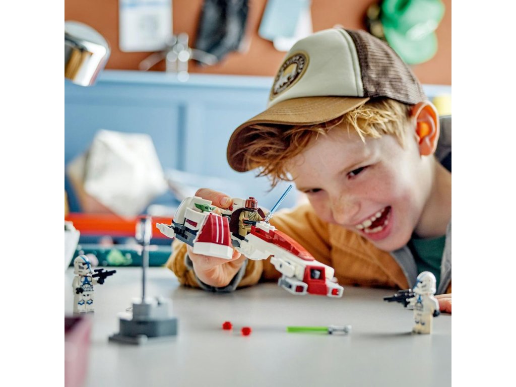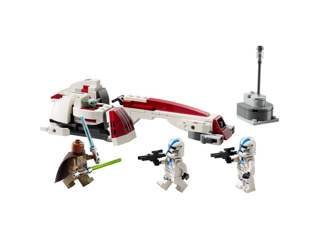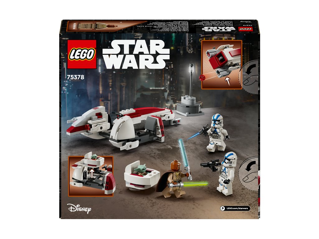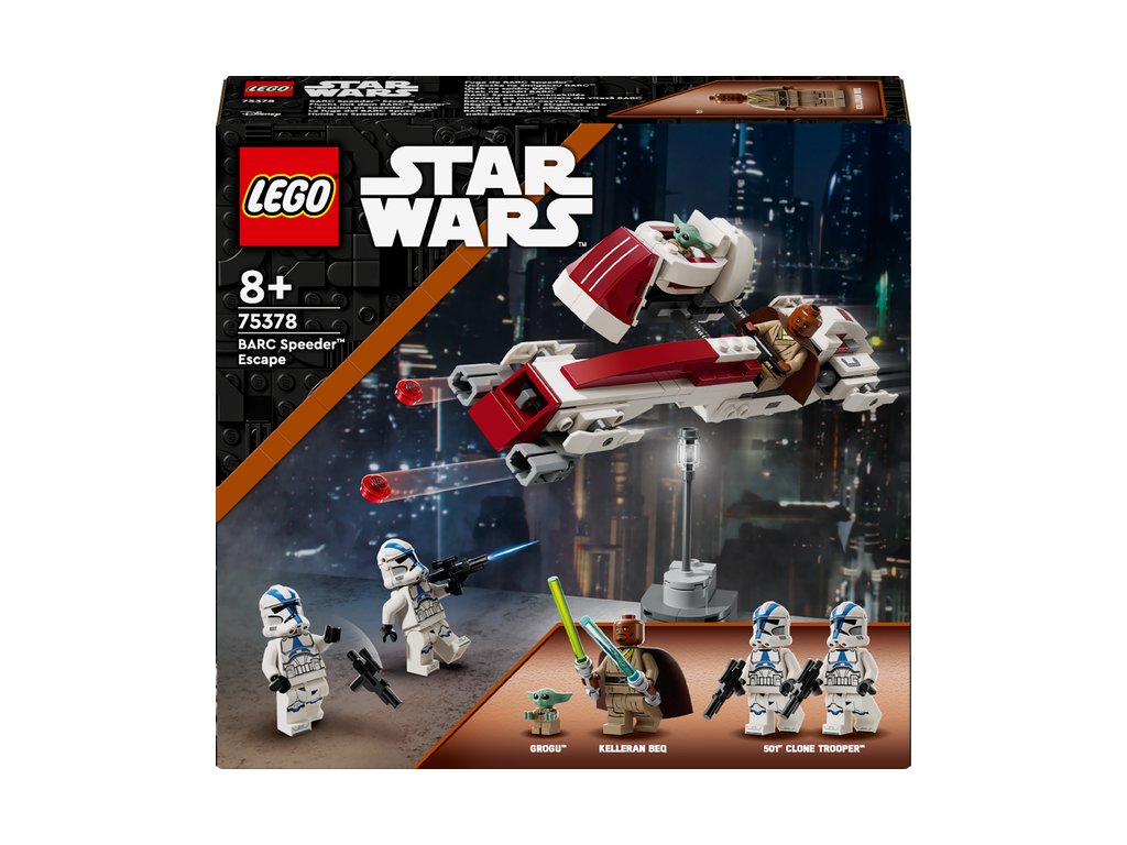 Připomeňte si scénu Útěku na spídru BARC z 3. řady seriálu Star Wars: The Mandalorian s touto jedinečnou stavebnicí LEGO® Star Wars™ (75378). Model představuje skvělý dárek pro děti, fanoušky a sběratele Star Wars od 8 let a najdete v něm spídrovou motorku s postranním vozíkem z kostek LEGO. Součástí spídru je kokpit pro minifigurku a 2 vystřelovače a do odnímatelného postranního vozíku lze připojit vznášející se kočárek Grogua. Ve stavebnici také najdete malý model scenérie a 3 minifigurky LEGO: Kellerana Beqa s modrým a zeleným světelným mečem a 2 klonované vojáky z 501. legie s blastery, a navíc figurku LEGO Grogua (kterého fanoušci někdy označují jako malého Yodu), se kterými se můžete těšit na kreativní hru plnou akce.