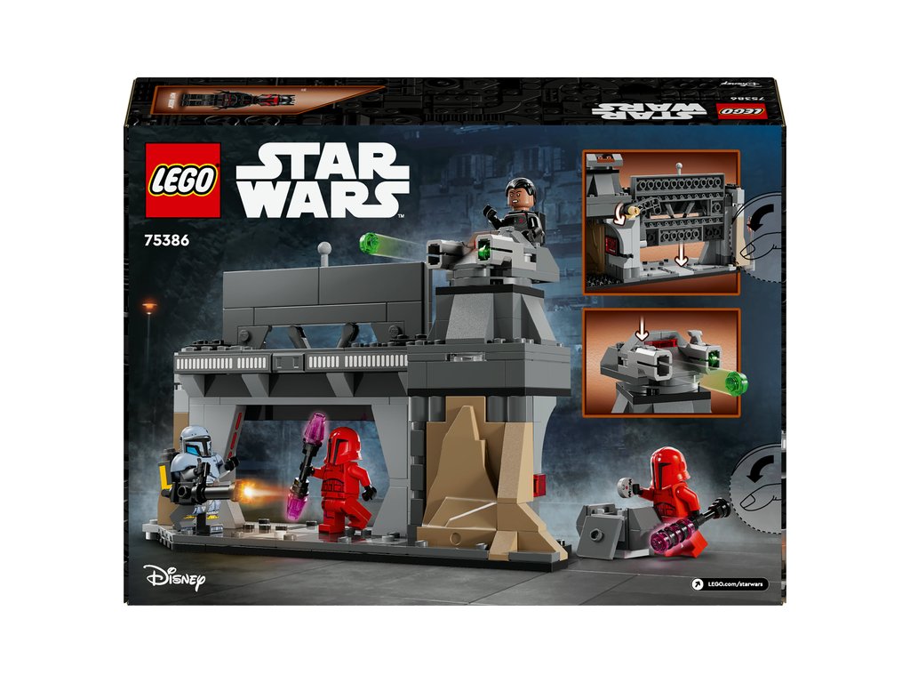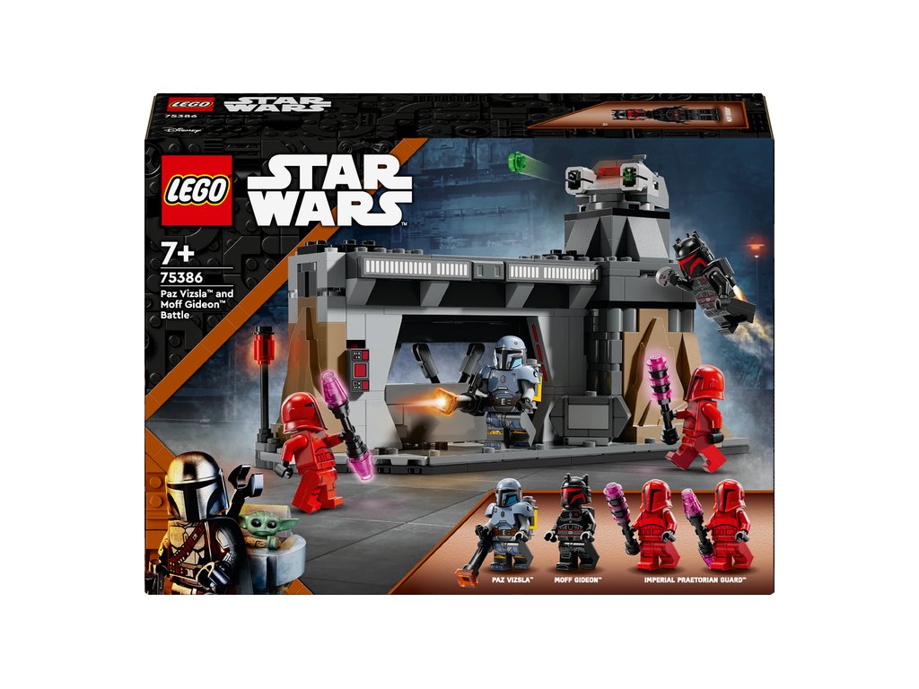 Postavte si se stavebnicí LEGO® Star Wars™ (75386) Souboj Paze Vizsly a Moffa Gideona pro kluky, holky a fanoušky od 7 let napínavé scény z 3. řady seriálu Star Wars: The Mandalorian. Tato stavebnice z kostek LEGO představuje parádní fantasy dárek pro děti a součástí je mandaloriánská základna s obrněnými dveřmi se spouští, která se aktivuje při zabouchnutí, ovládací panely a otočnou vystřelovací věž. Nechybí ani 4 sběratelské minifigurky LEGO Star Wars: The Mandalorian, se kterými si můžete přehrávat souboj Paze Vizsly a Moffa Gideoa (v brnění Dark troopera) a imperiální pretoriánskou stráží, a navíc doplňky, jako je jetpack Moffa Gideona a úložný box s termálním detonátorem pro kreativní hraní.